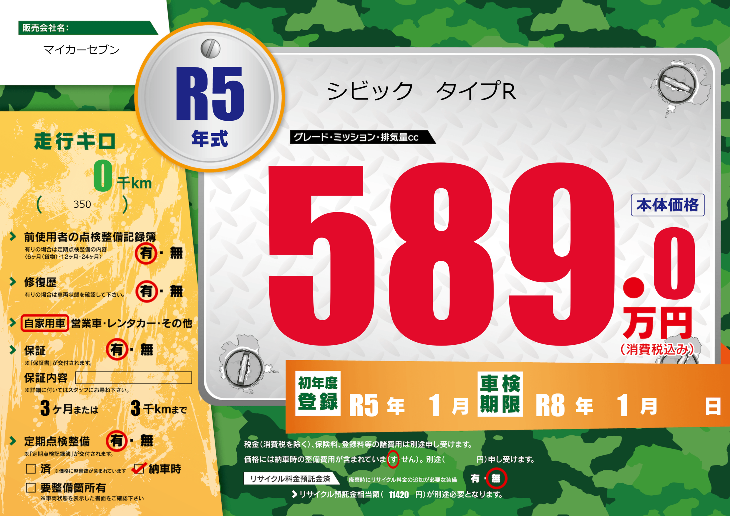 | 車検制限 | R8年 1月 - 日 | ||