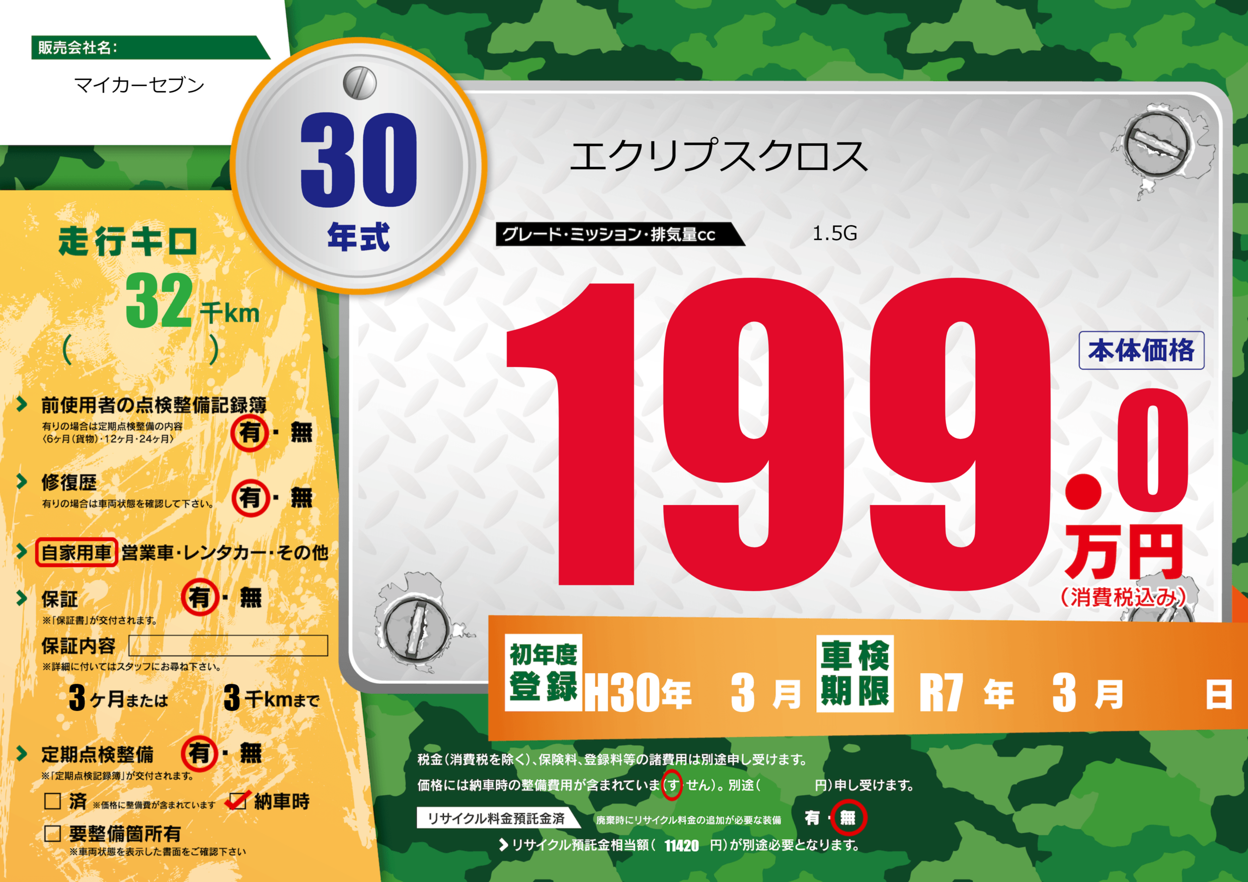 | 車名 | エクリプスクロス | グレード ミッション 排気量 |