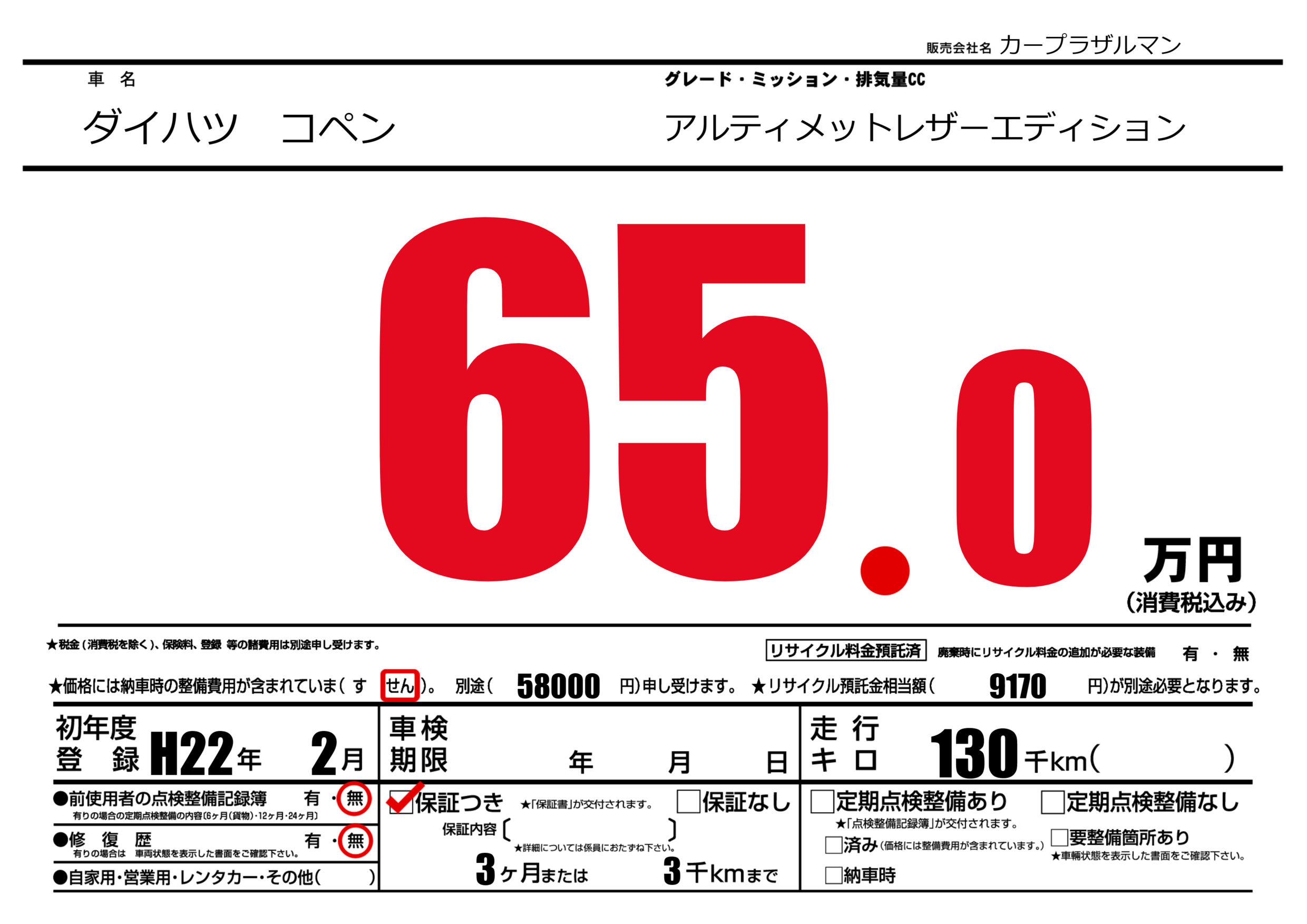 | 車名 | ダイハツ コペン | グレード ミッション 排気量 |