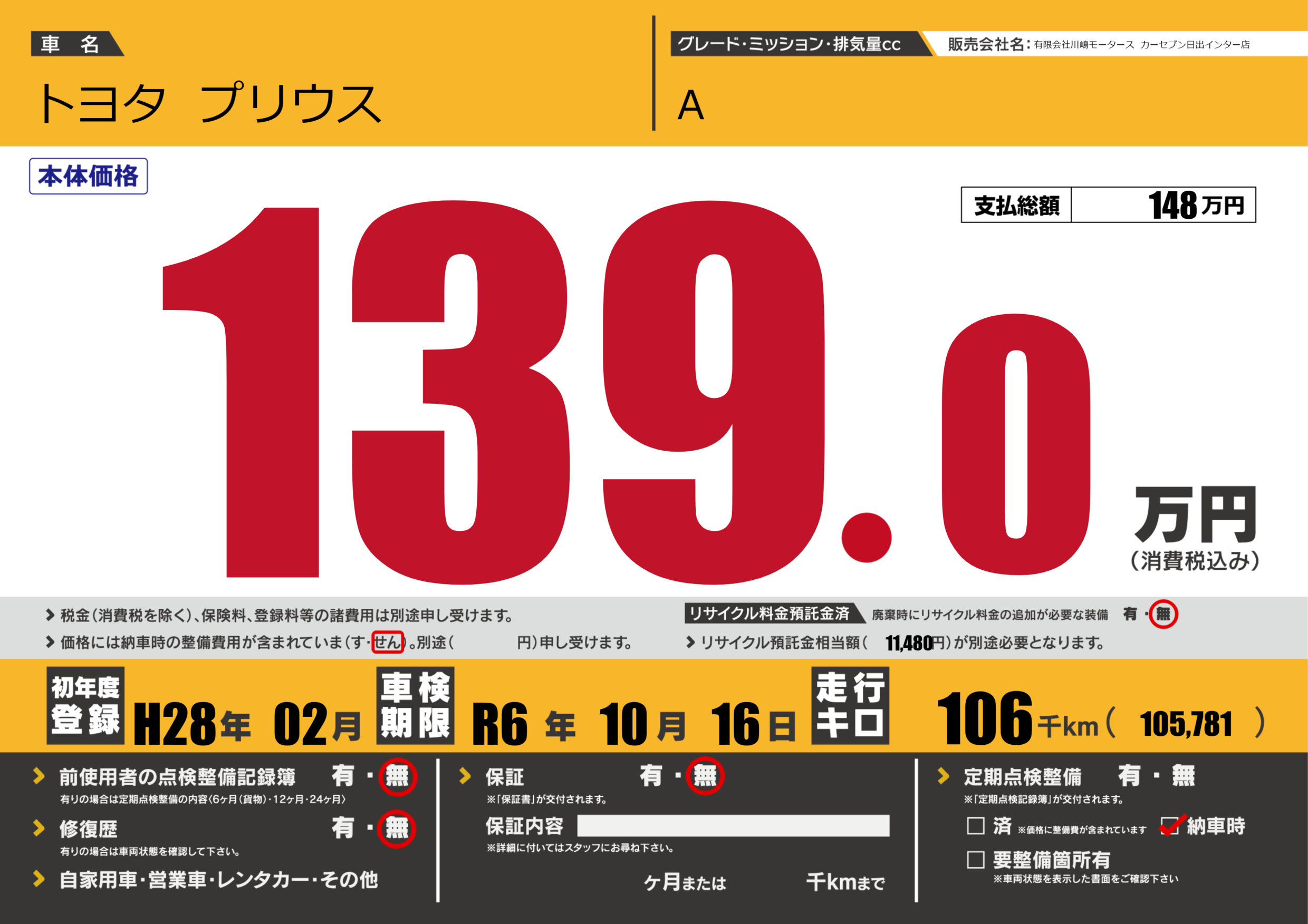 | 車名 | トヨタ プリウス | グレード ミッション 排気量 |