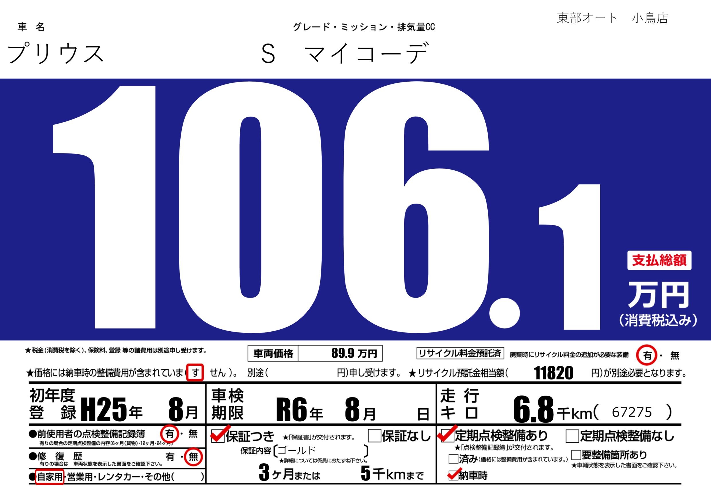 | 車名 | プリウス | グレード ミッション 排気量 |