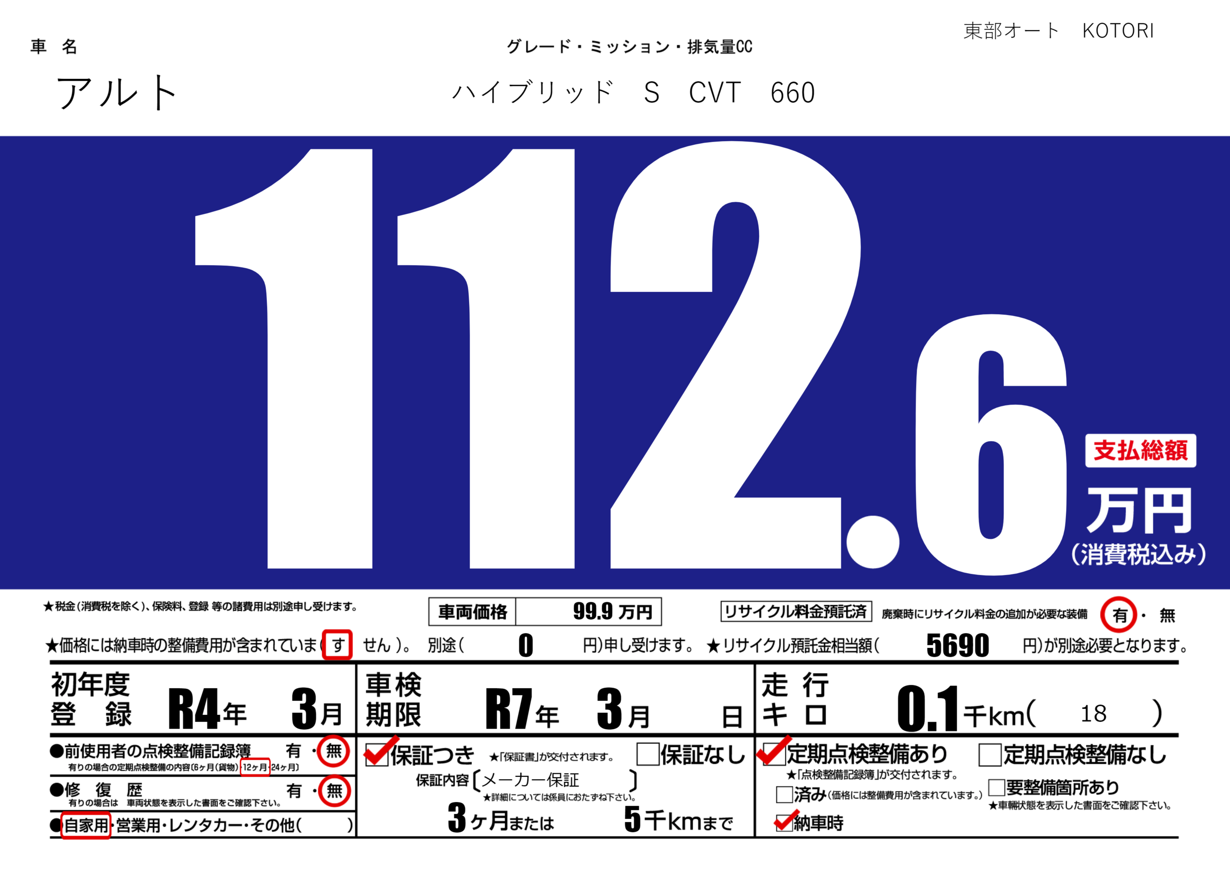 保証付き 保証内容(メーカー保証) 3ヶ月または(5)千kmまで |
