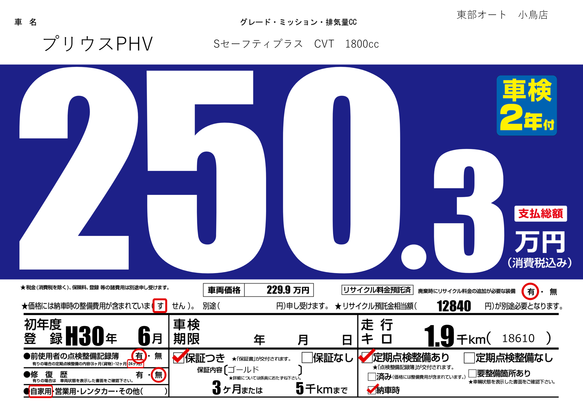 | 車名 | プリウスPHV | グレード ミッション 排気量 |