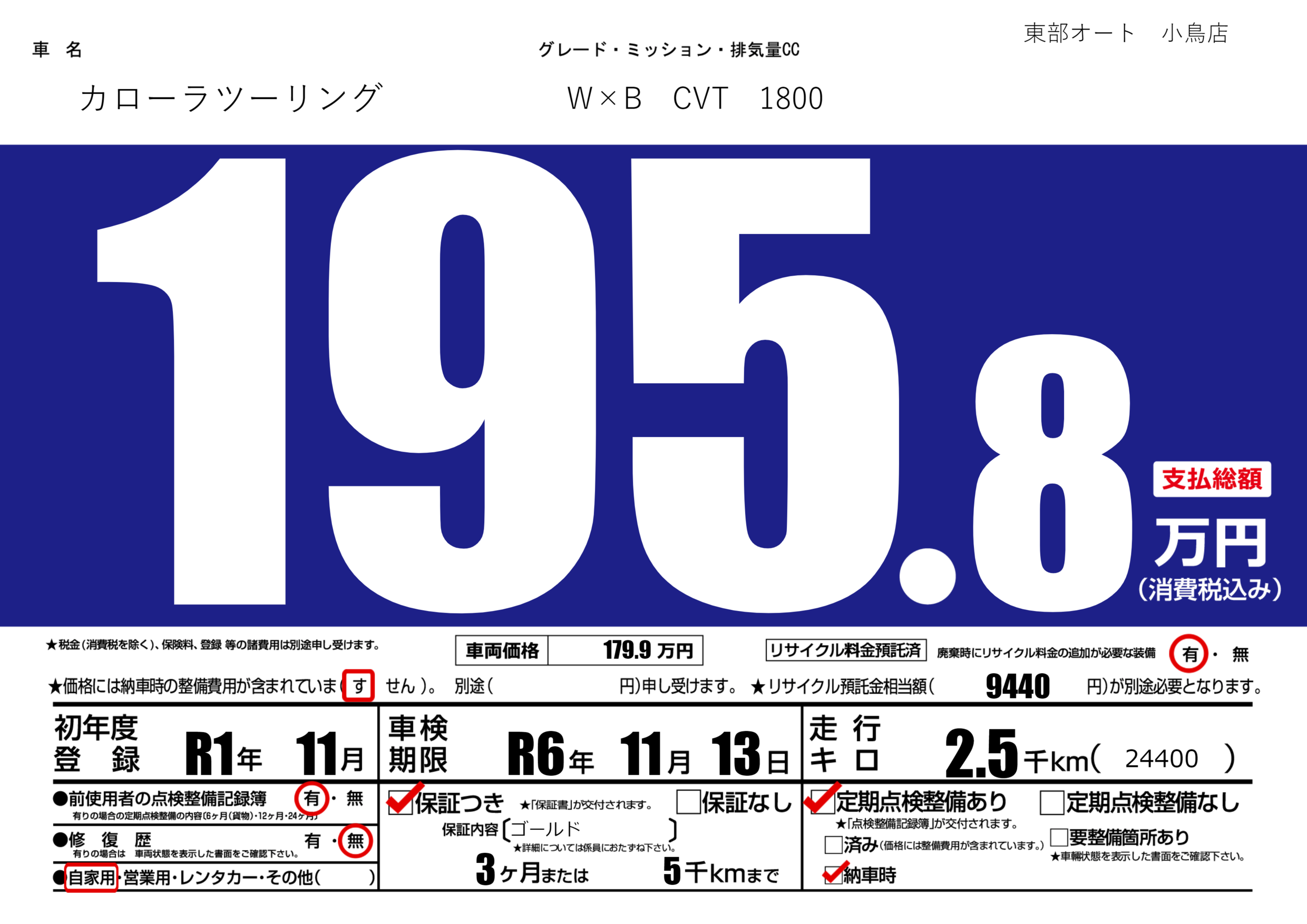 保証付き 保証内容(ゴールド) 3ヶ月または(5)千kmまで |