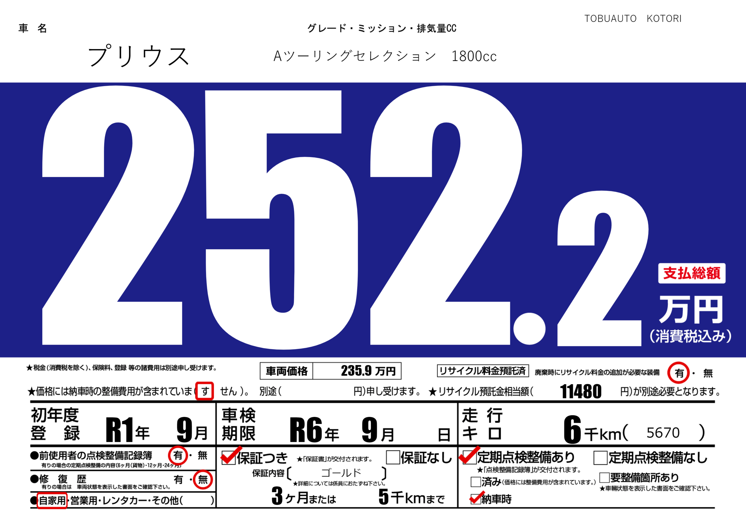 | 車検制限 | R6年 9月 - 日 | ||