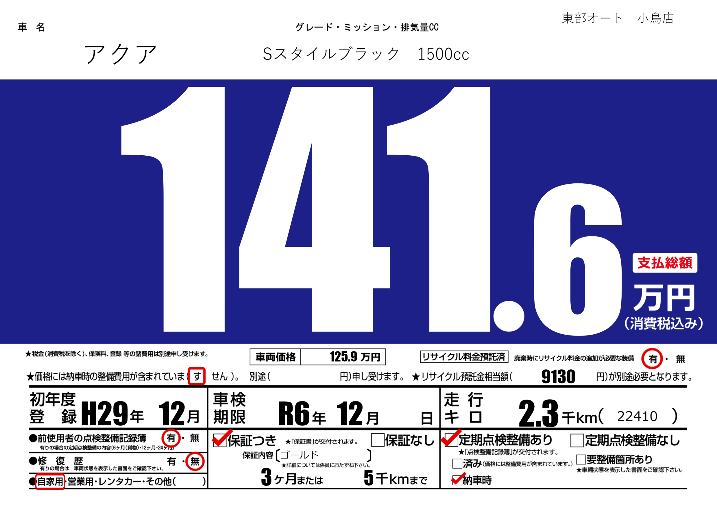 保証付き 保証内容(ゴールド) 3ヶ月または(5)千kmまで |