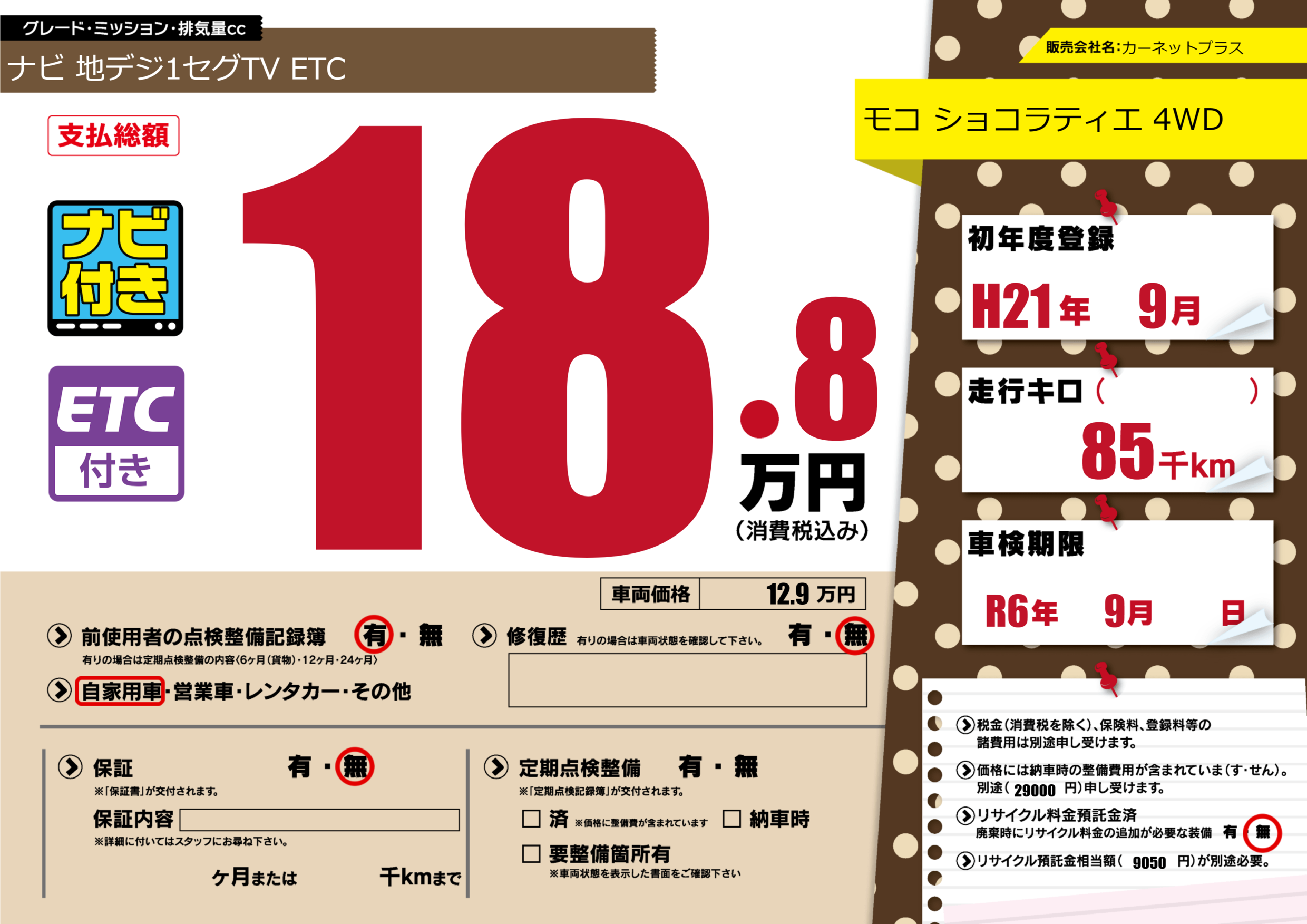 | 車名 | モコ ショコラティエ 4WD | グレード ミッション 排気量 |