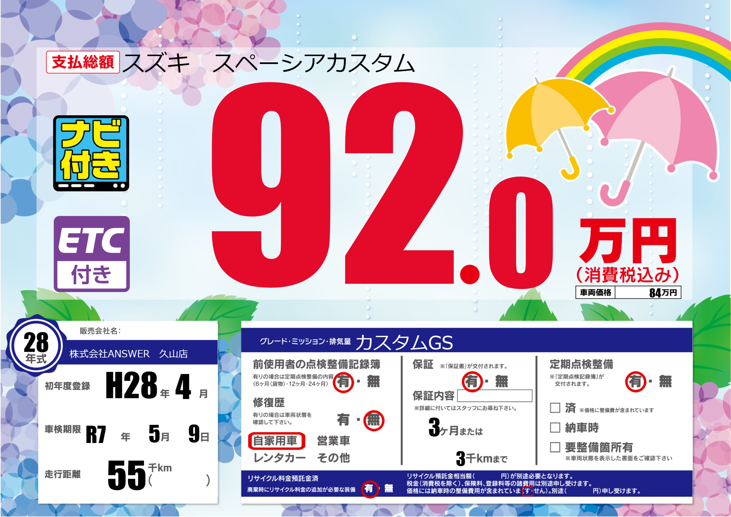 | 車名 | スズキ スペーシアカスタム | グレード ミッション 排気量 |