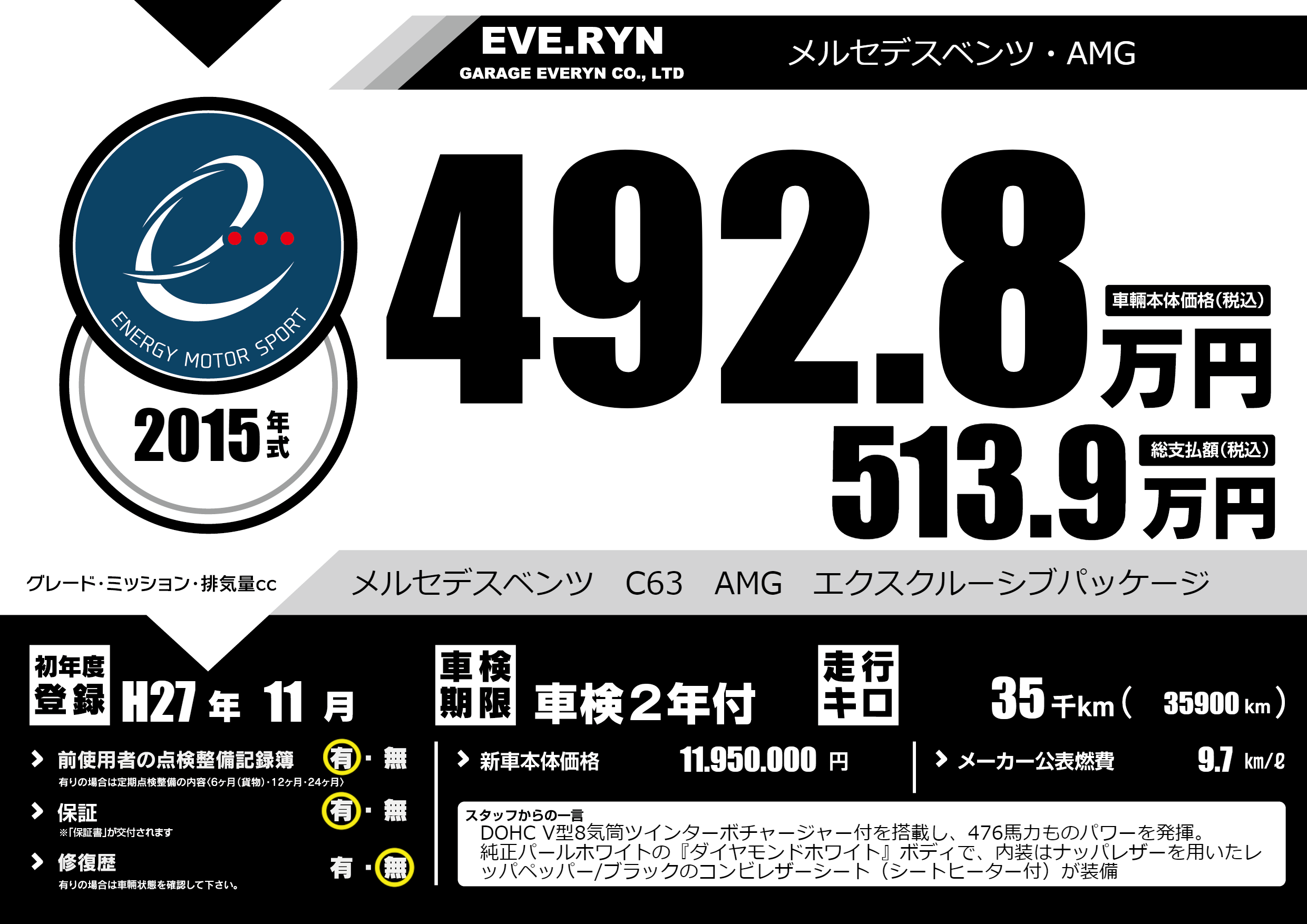| 車名 | メルセデスベンツ・AMG | グレード ミッション 排気量 |