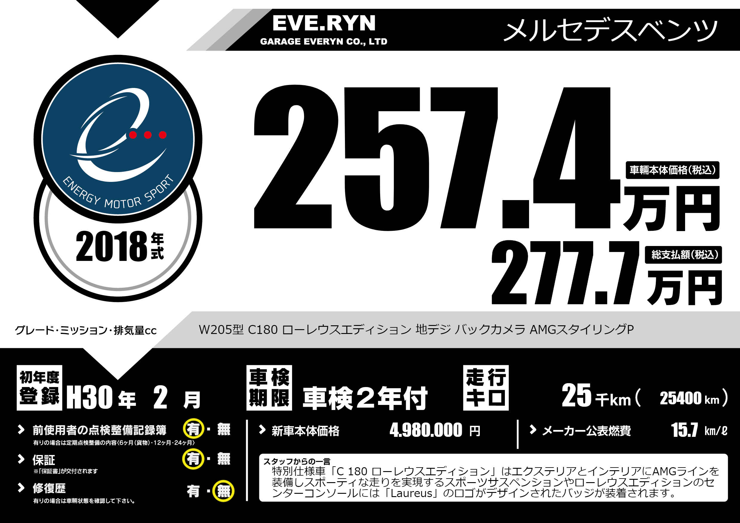 W205型 C180 ローレウスエディション 地デジ バックカメラ AMGスタイリングP |
