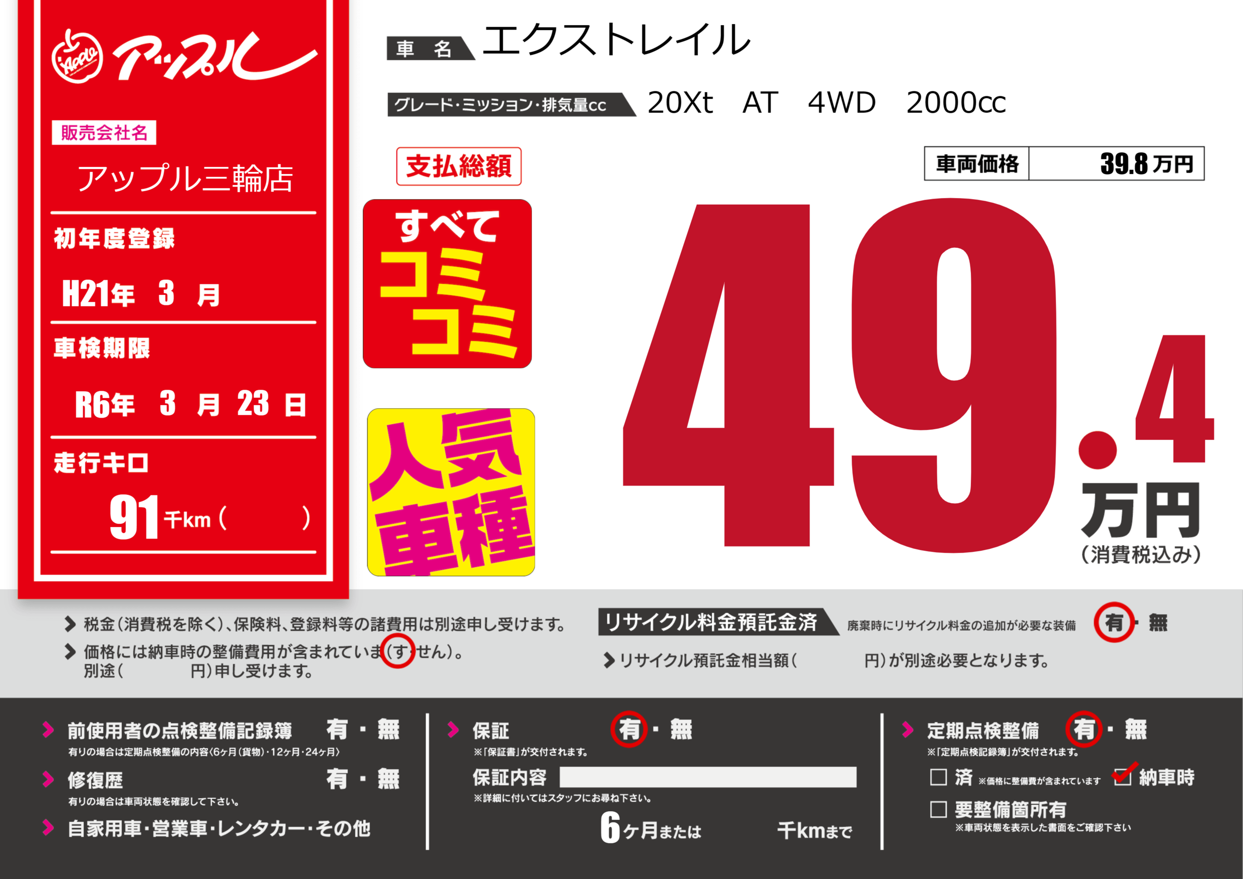 保証付き 保証内容(---) 6ヶ月または()千kmまで |