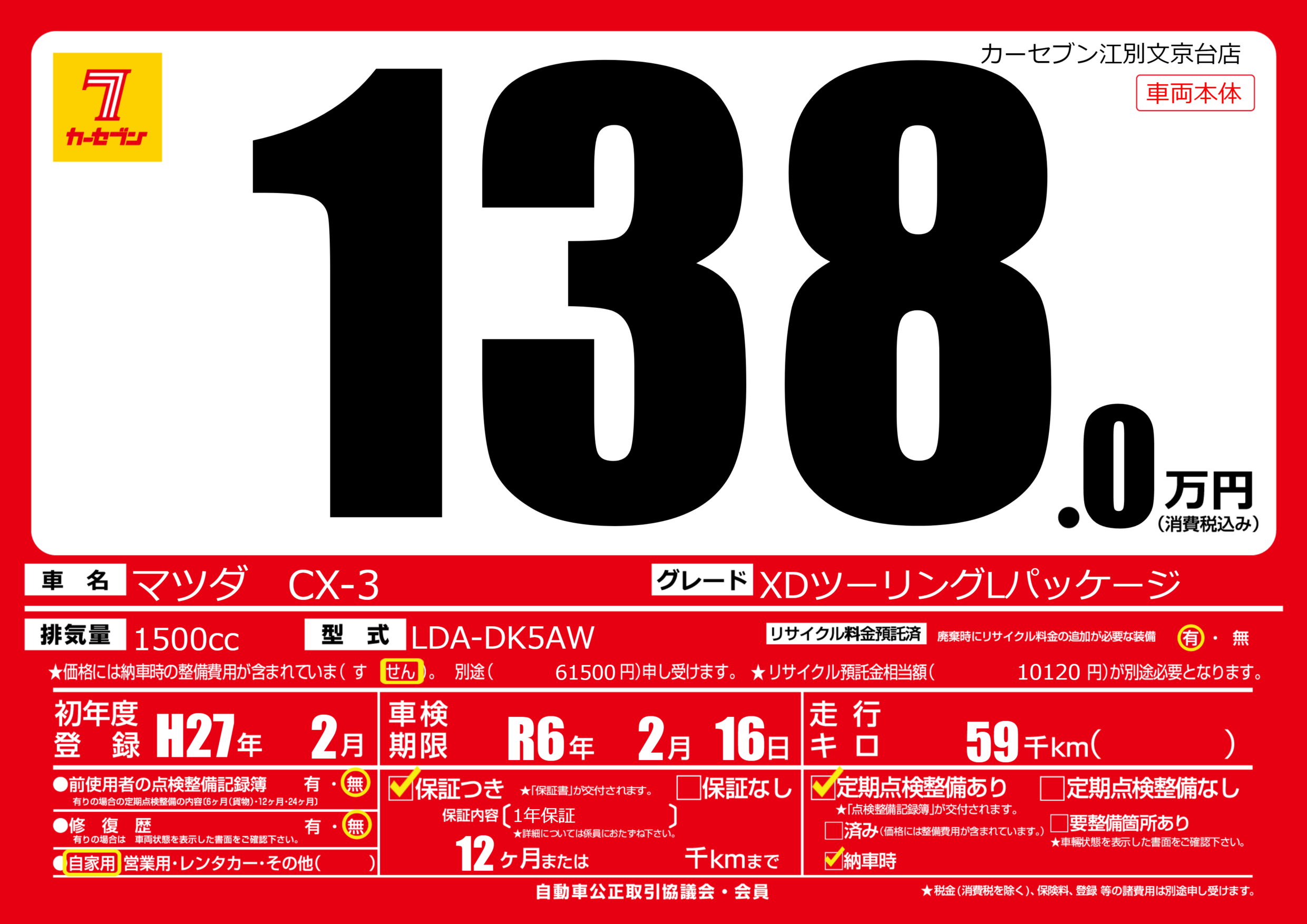 | 車名 | マツダ CX-3 | グレード ミッション 排気量 |