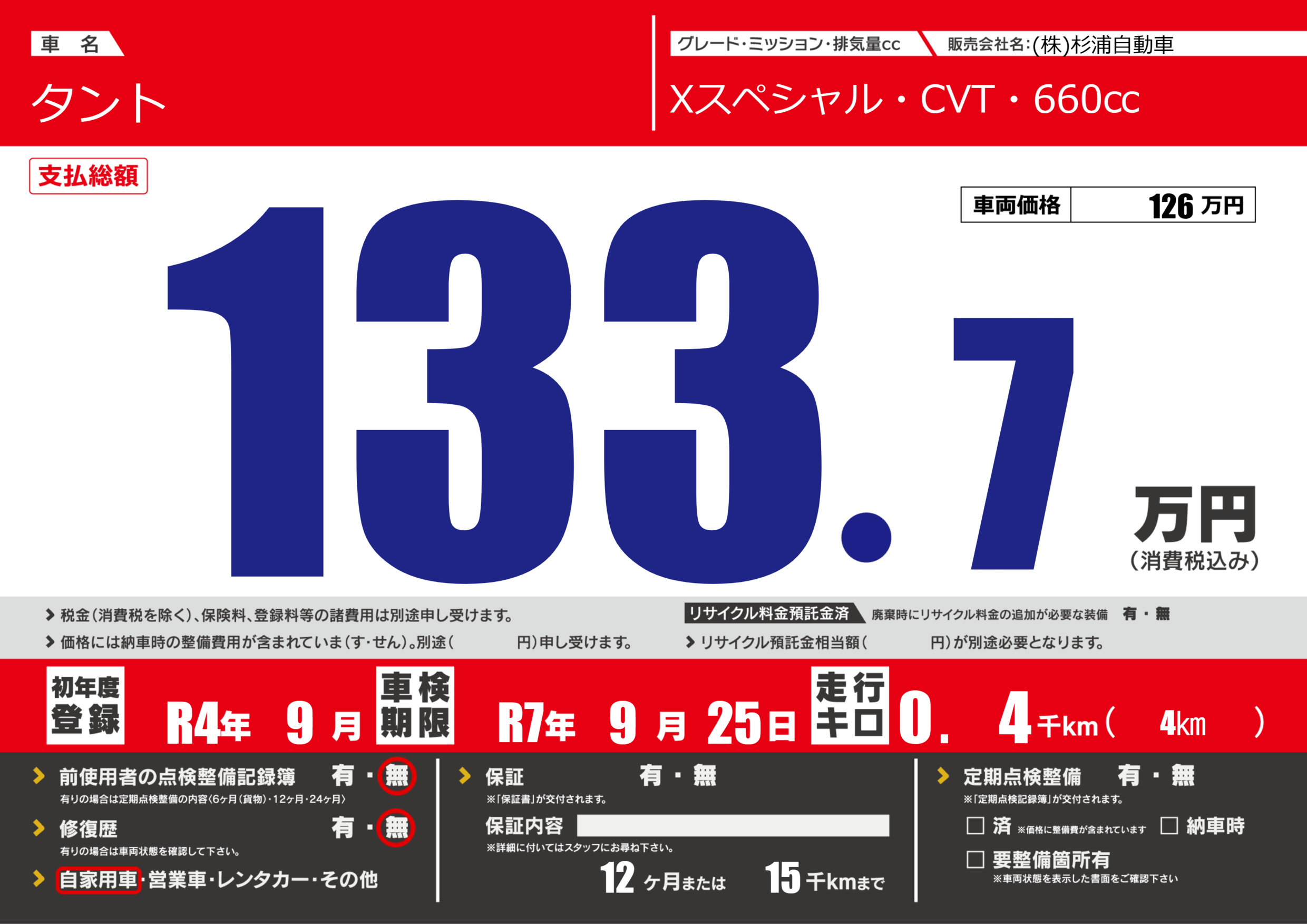 | 走行キロ | - | 初年度登録 | R4年9月 |