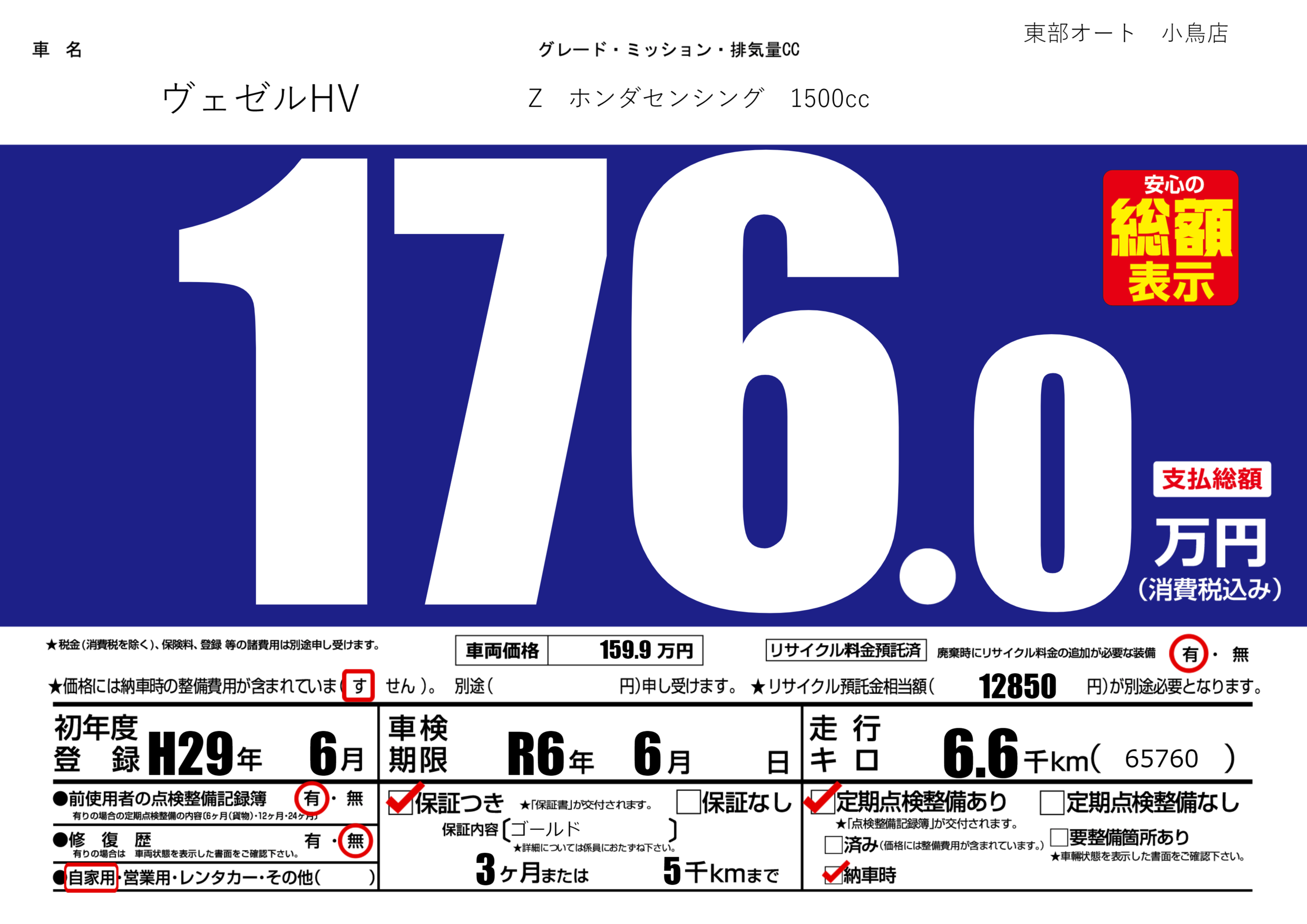 | 車名 | ヴェゼルHV | グレード ミッション 排気量 |