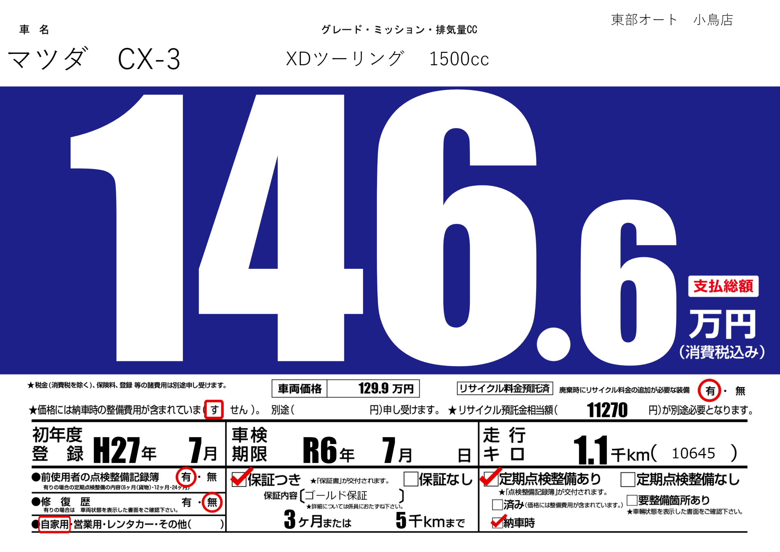 保証付き 保証内容(ゴールド保証) 3ヶ月または(5)千kmまで |