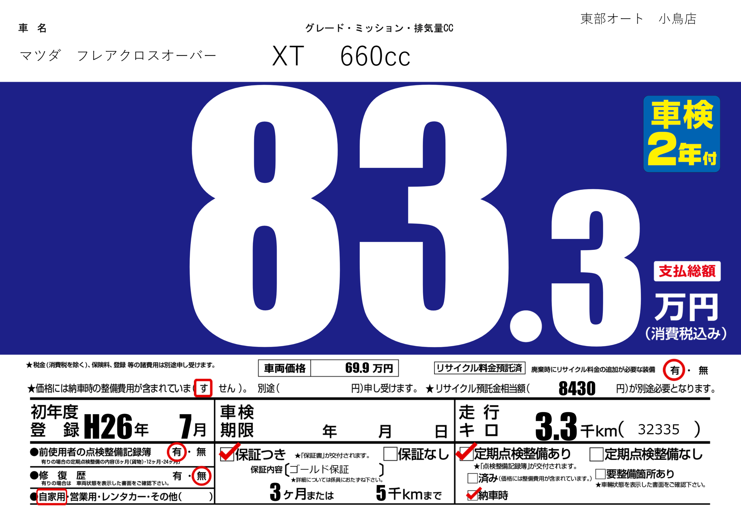| 走行キロ | 0.3万km | 初年度登録 | H26年7月 |