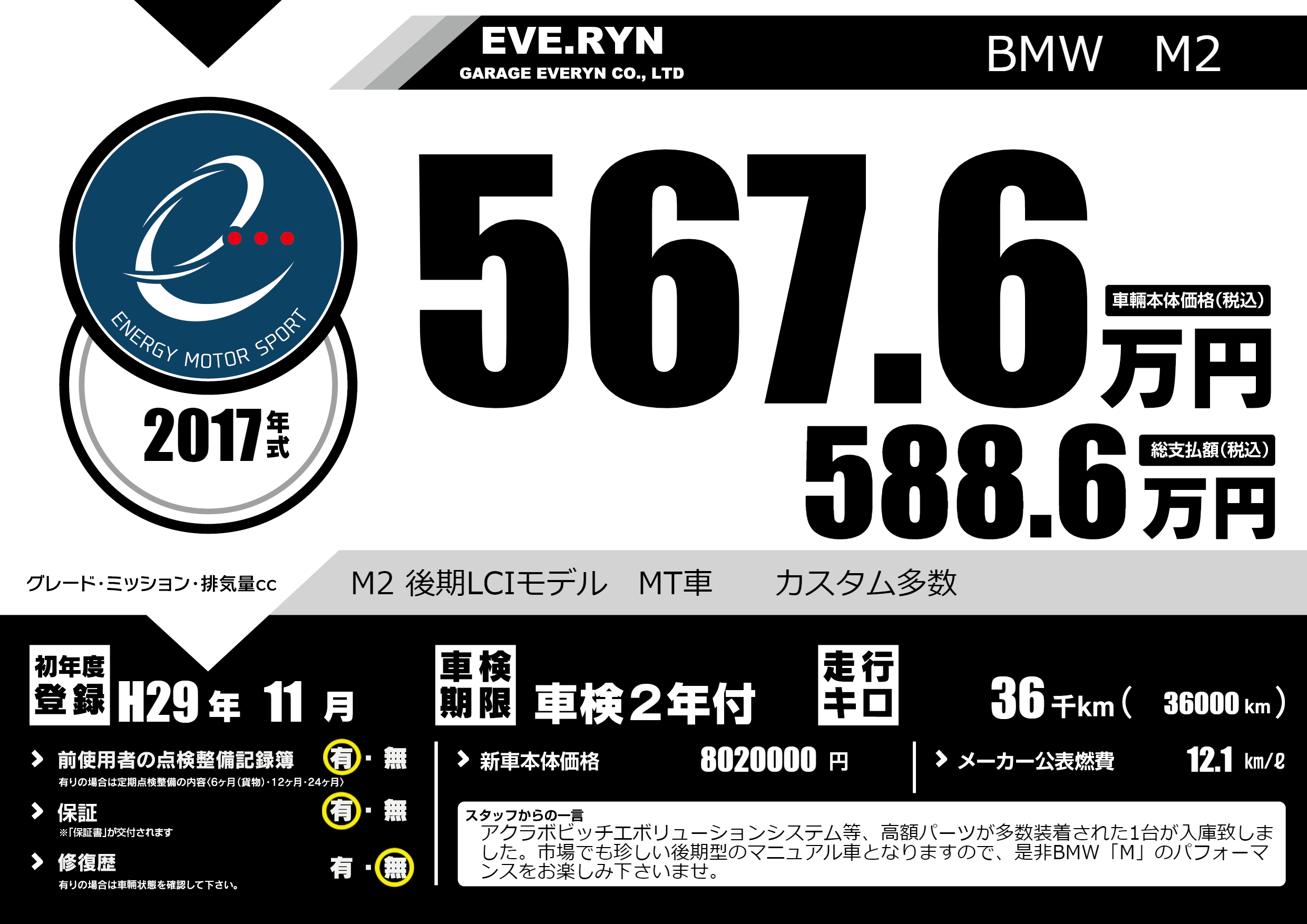 | 車名 | BMW M2 | グレード ミッション 排気量 |