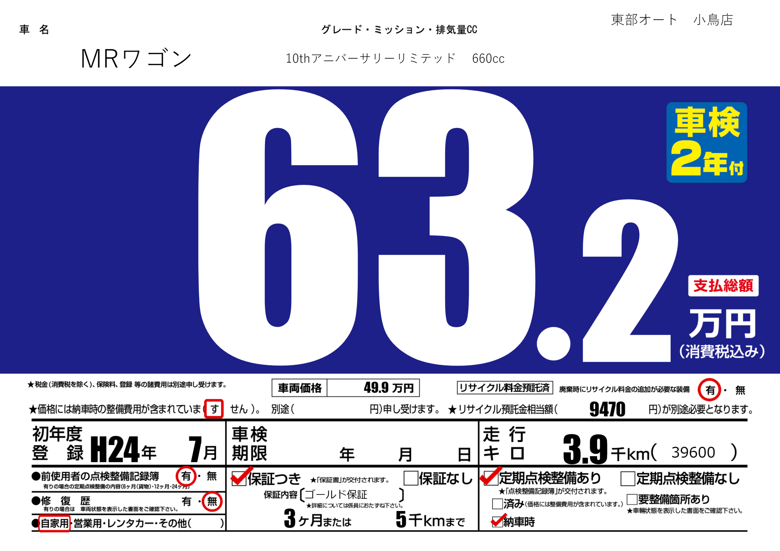 | 車名 | MRワゴン | グレード ミッション 排気量 |