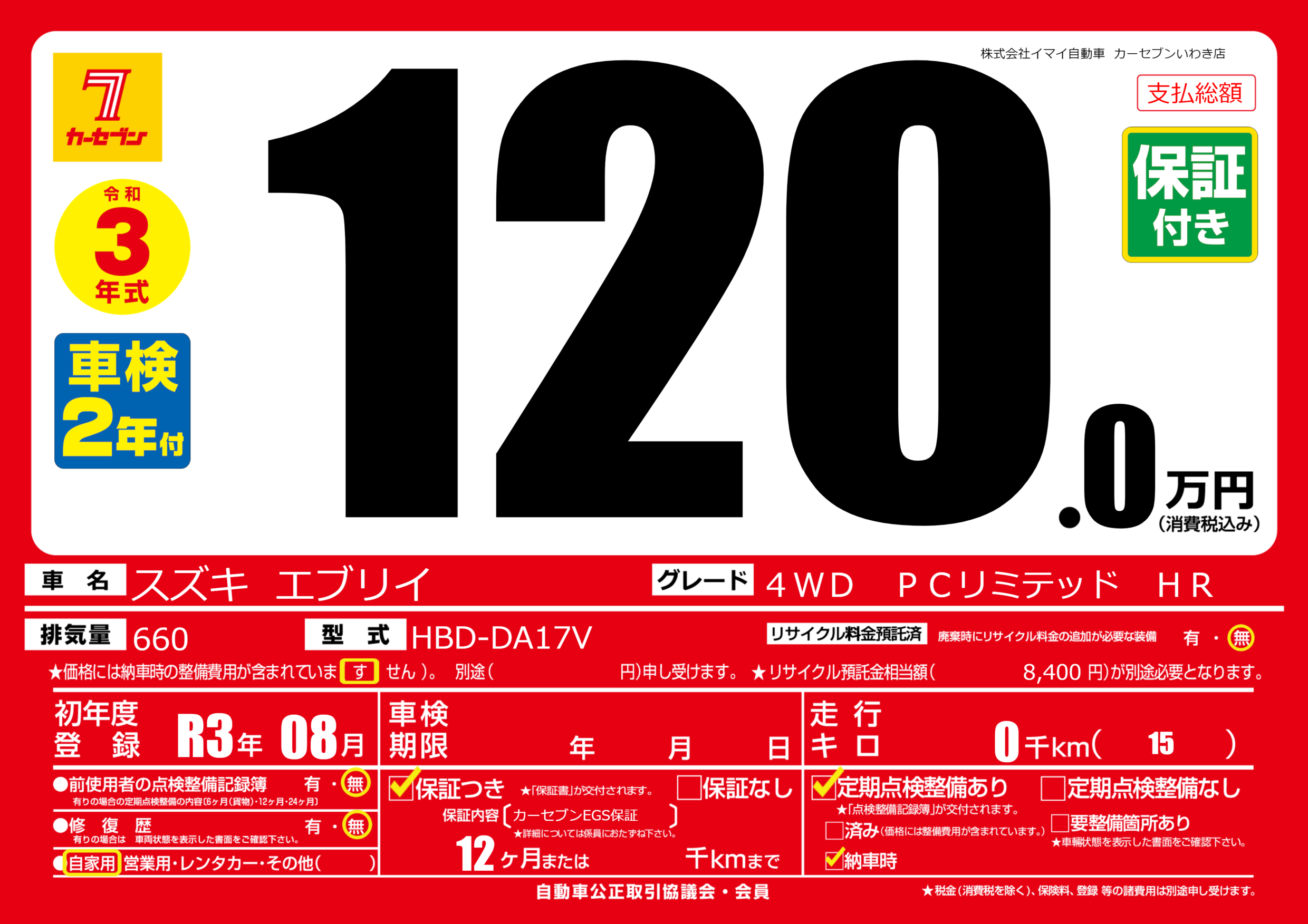 保証付き 保証内容(カーセブンEGS保証) 12ヶ月または千km |