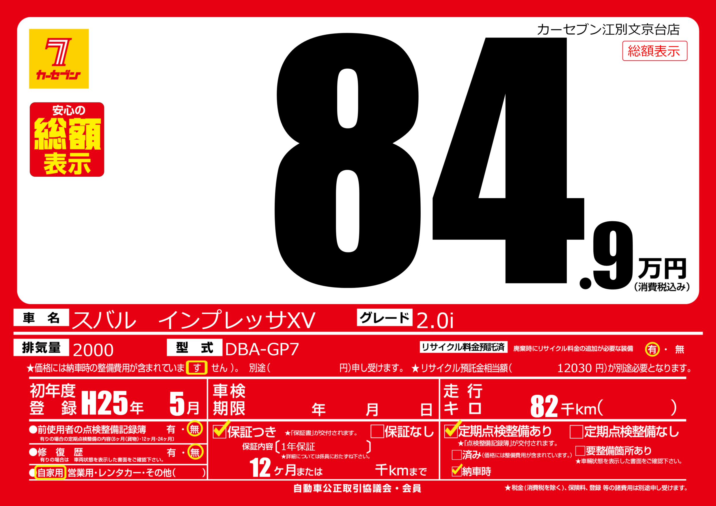 | 車名 | スバル インプレッサXV | グレード ミッション 排気量 |