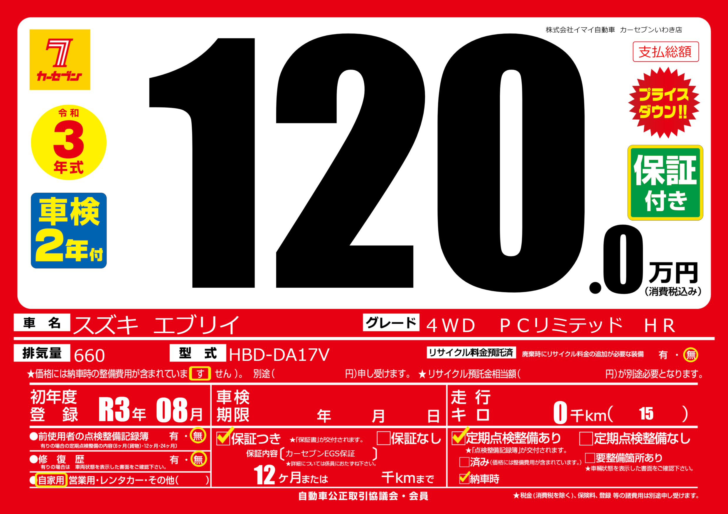 保証付き 保証内容(カーセブンEGS保証) 12ヶ月または千km |