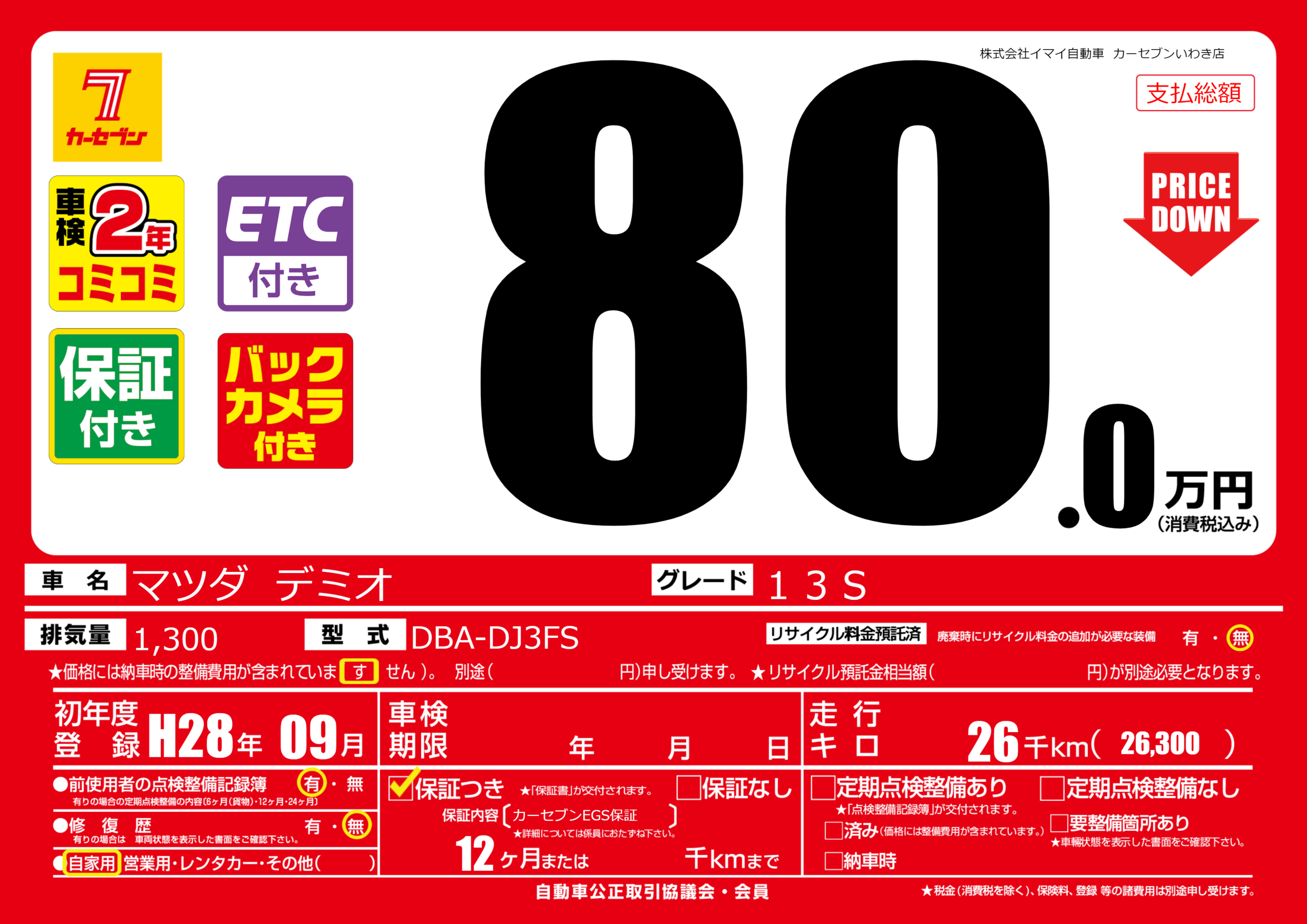| 車名 | マツダ デミオ | グレード ミッション 排気量 |