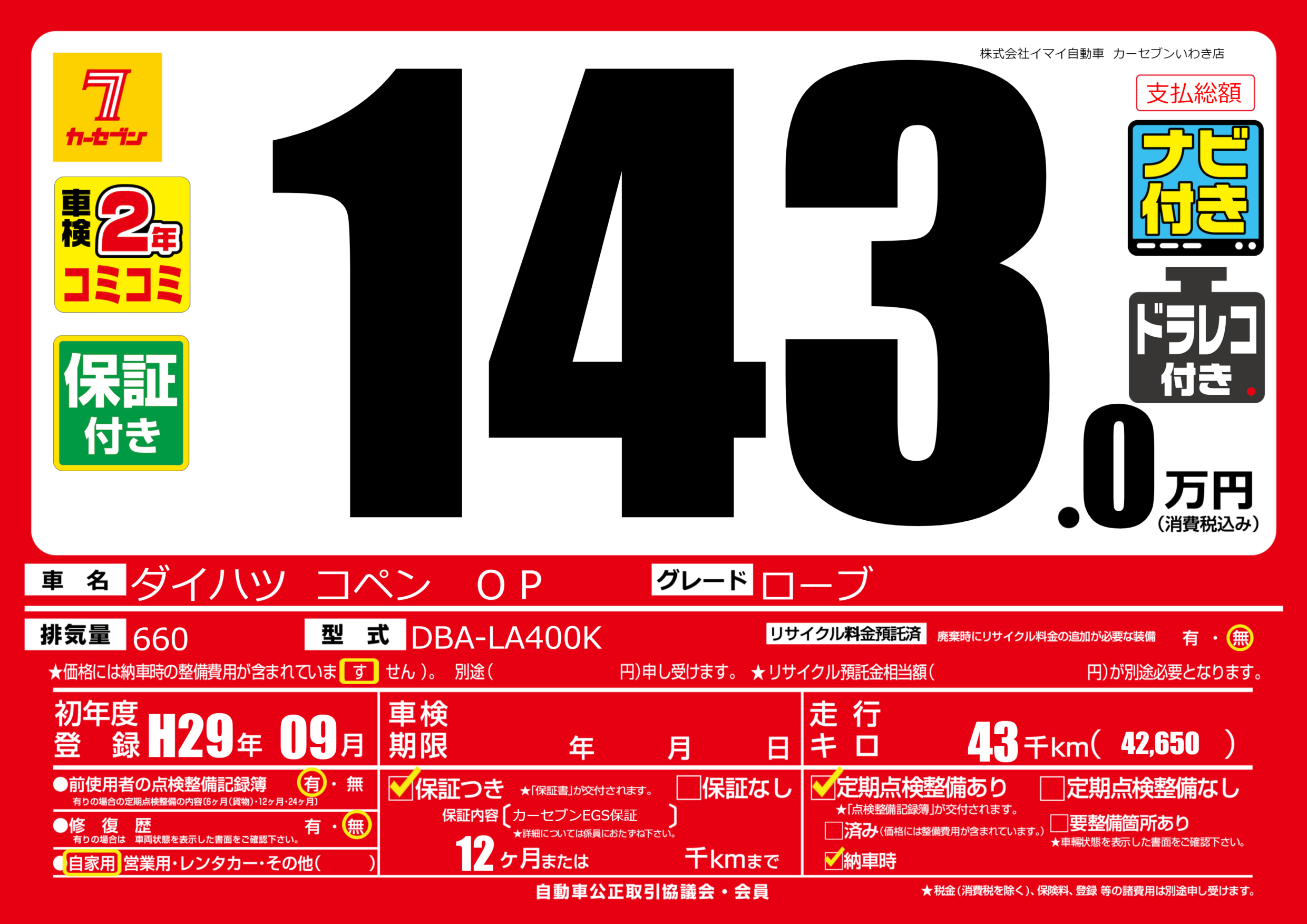 | 走行キロ | 4.3万km | 初年度登録 | H29年09月 |