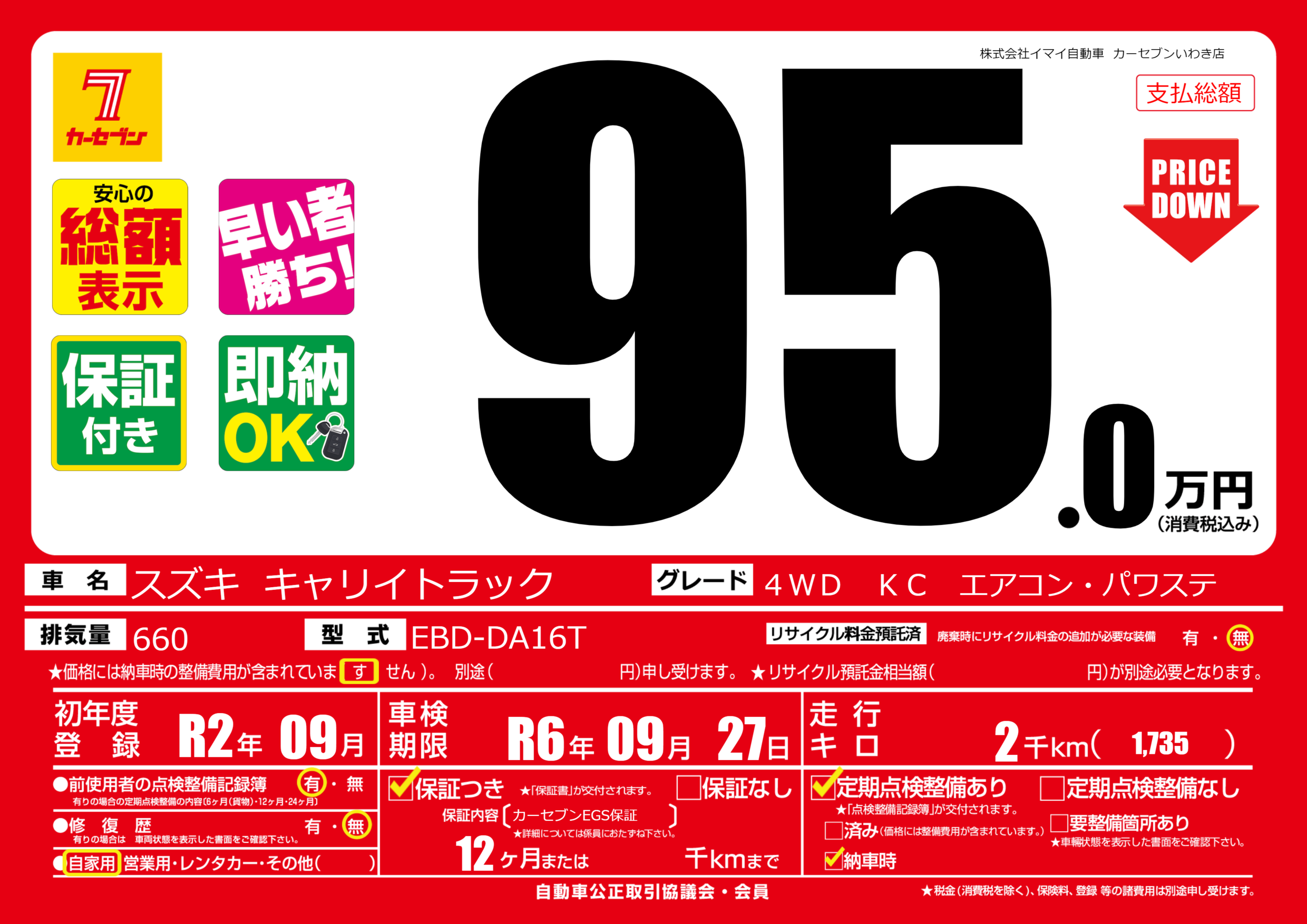 保証付き 保証内容(カーセブンEGS保証) 12ヶ月または千km |