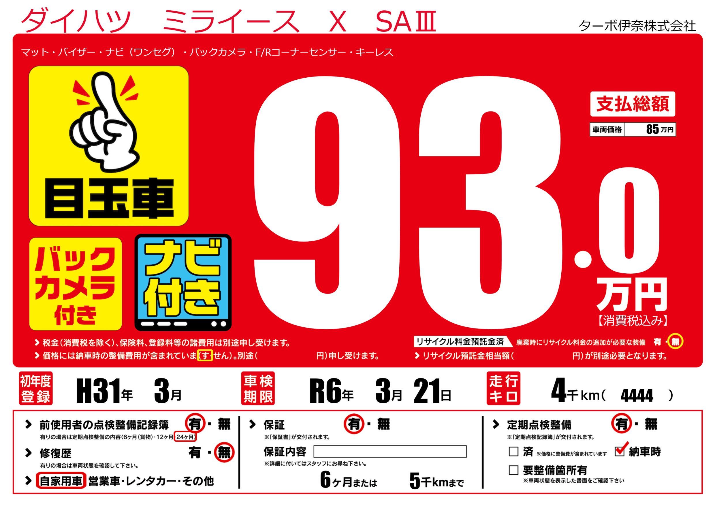 | 走行キロ | 0.4万km | 初年度登録 | H31年3月 |