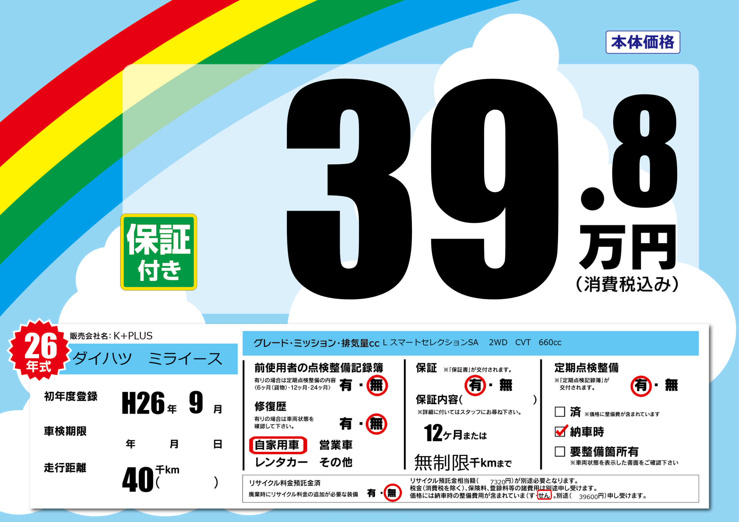 | 走行キロ | 4万km | 初年度登録 | H26年9月 |