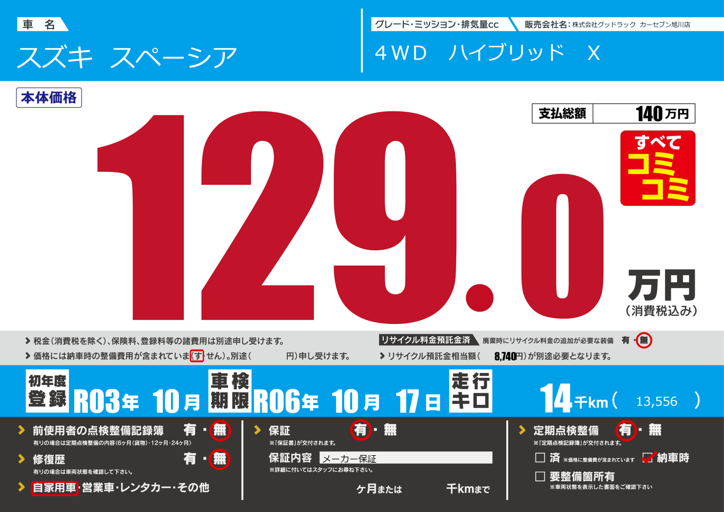 | 走行キロ | 1.4万km | 初年度登録 | R03年10月 |