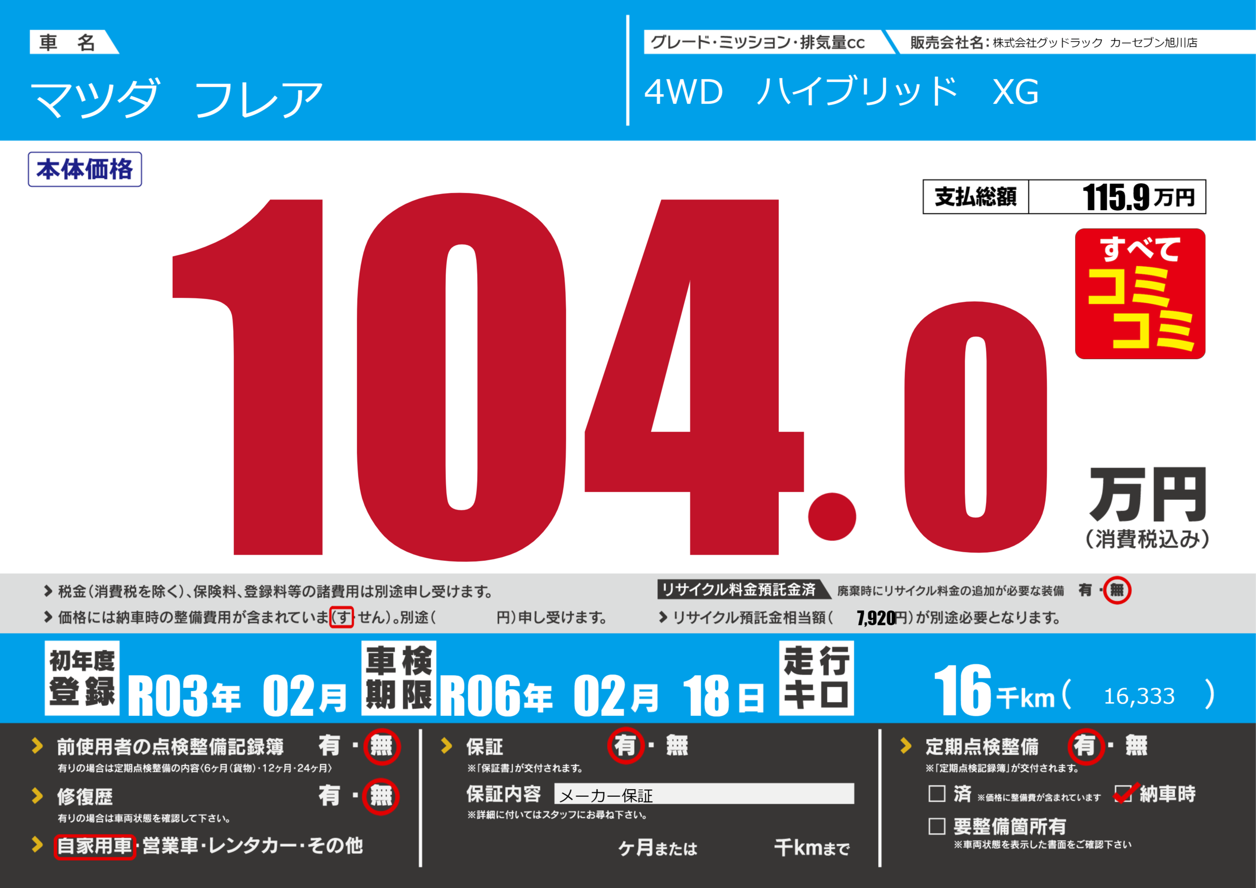 | 車名 | マツダ フレア | グレード ミッション 排気量 |