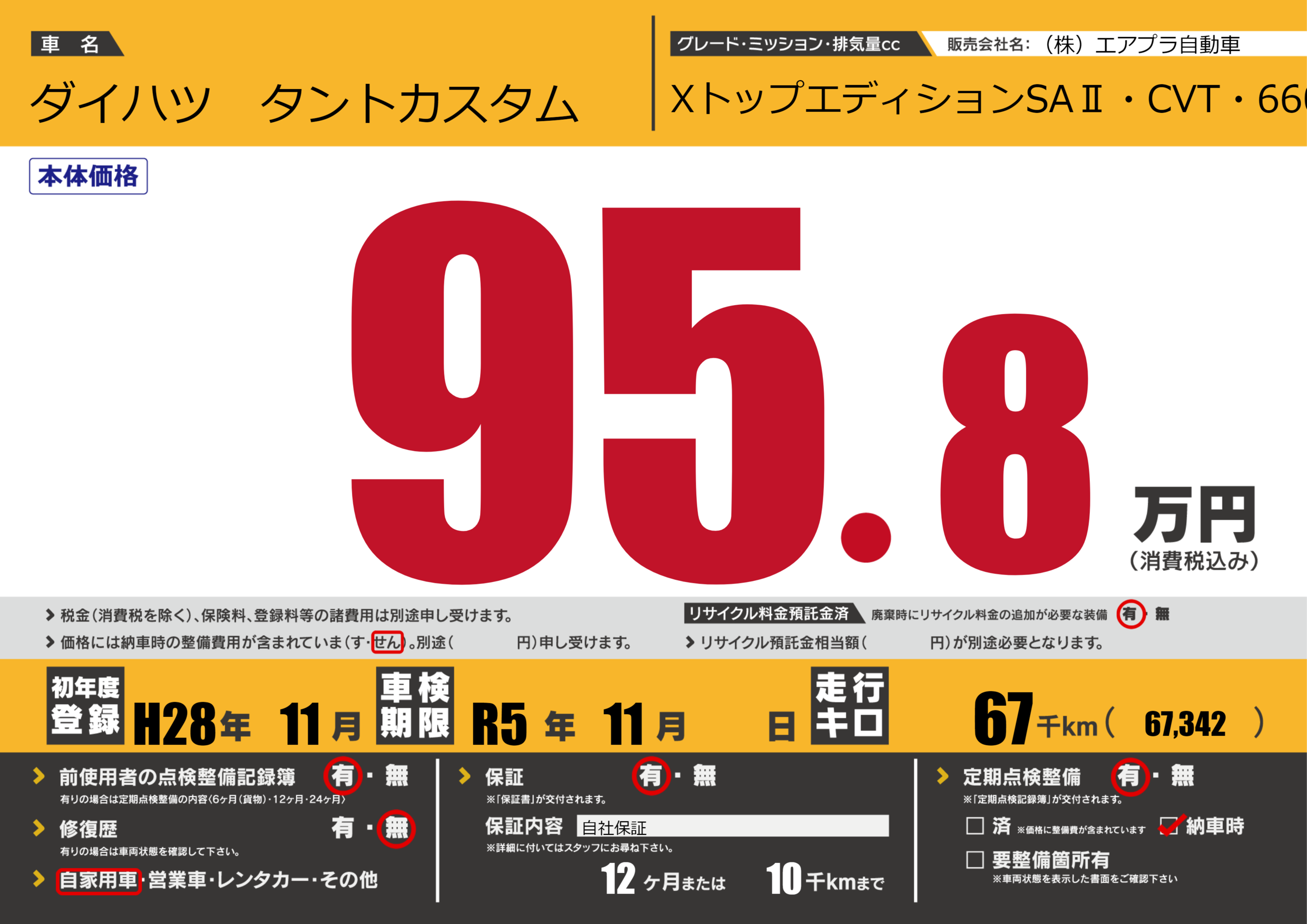 | 車名 | ダイハツ タントカスタム | グレード ミッション 排気量 |