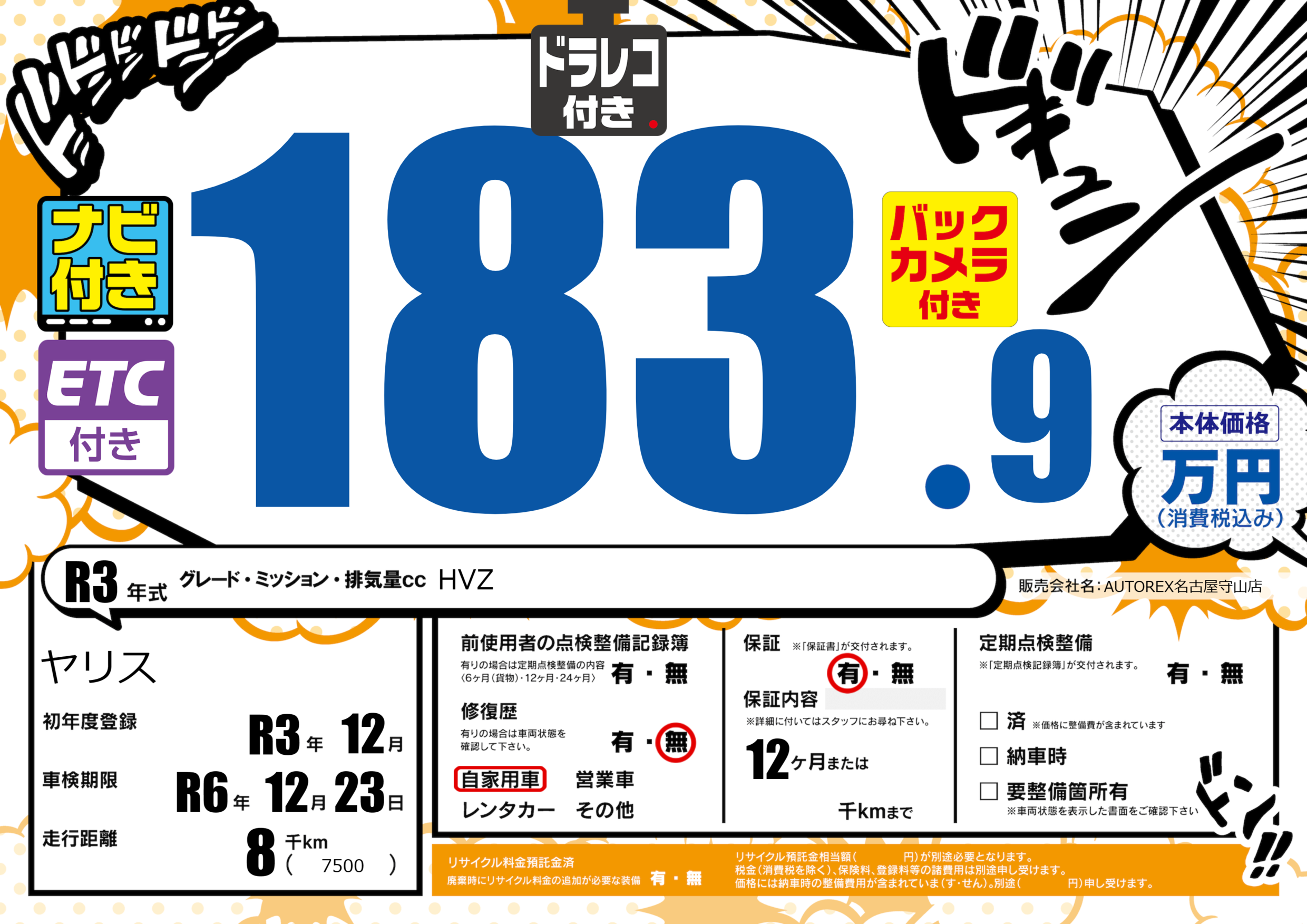 | 走行キロ | 0.8万km | 初年度登録 | R3年12月 |