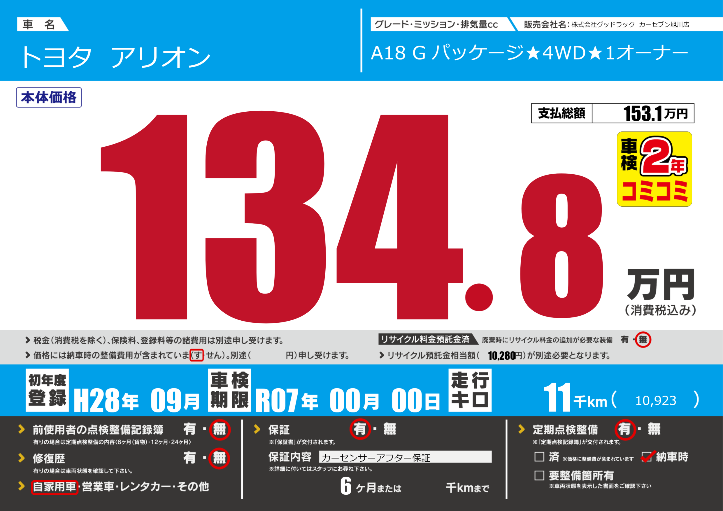 | 車名 | トヨタ アリオン | グレード ミッション 排気量 |
