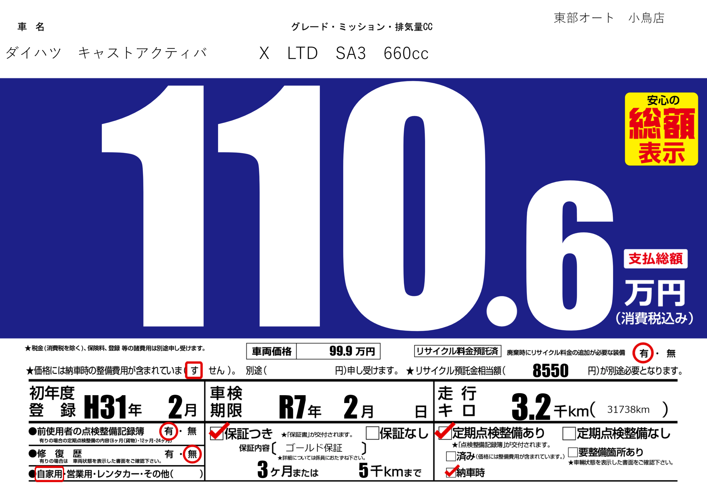 | 車名 | ダイハツ キャストアクティバ | グレード ミッション 排気量 |