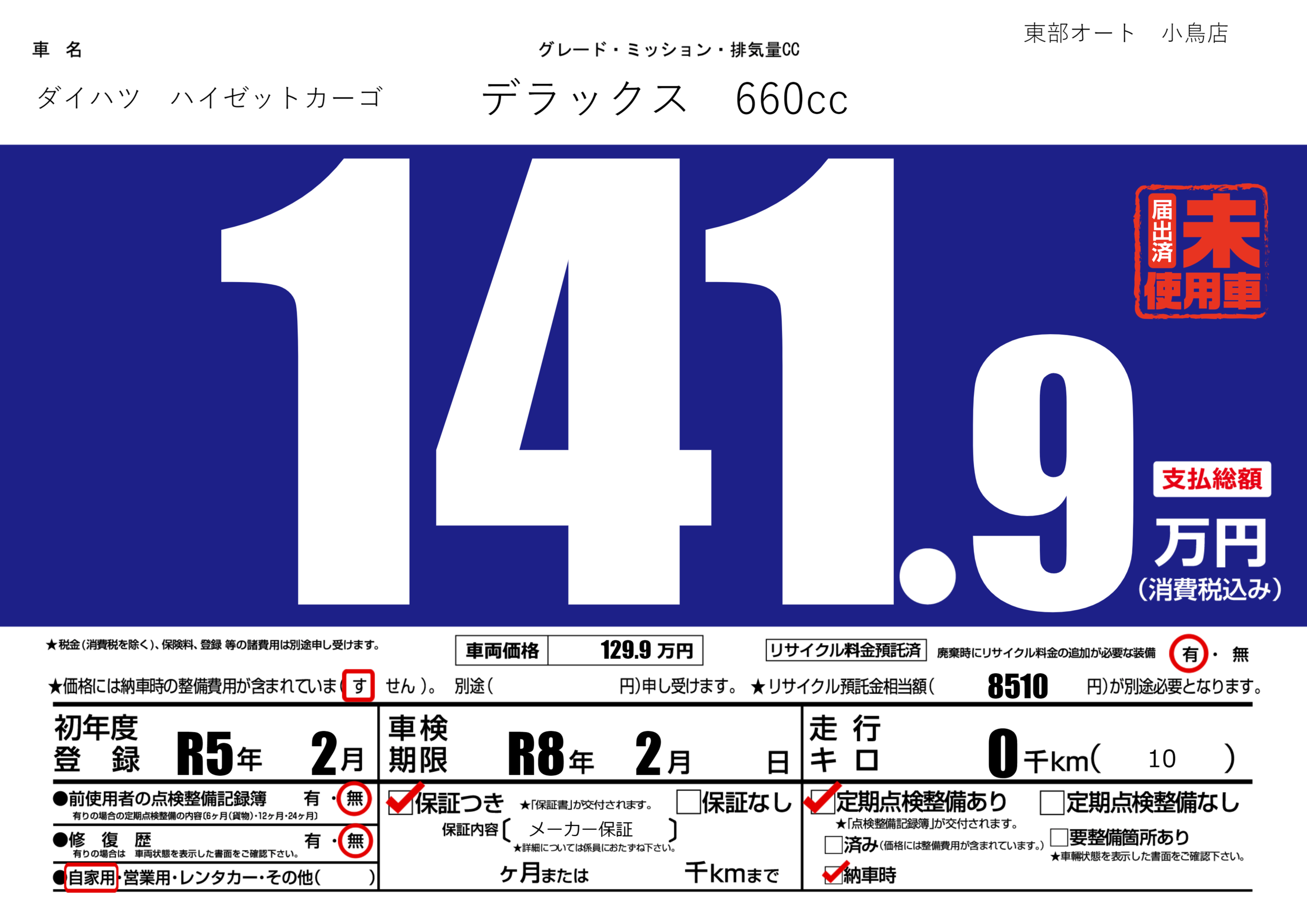 | 車名 | ダイハツ ハイゼットカーゴ | グレード ミッション 排気量 |