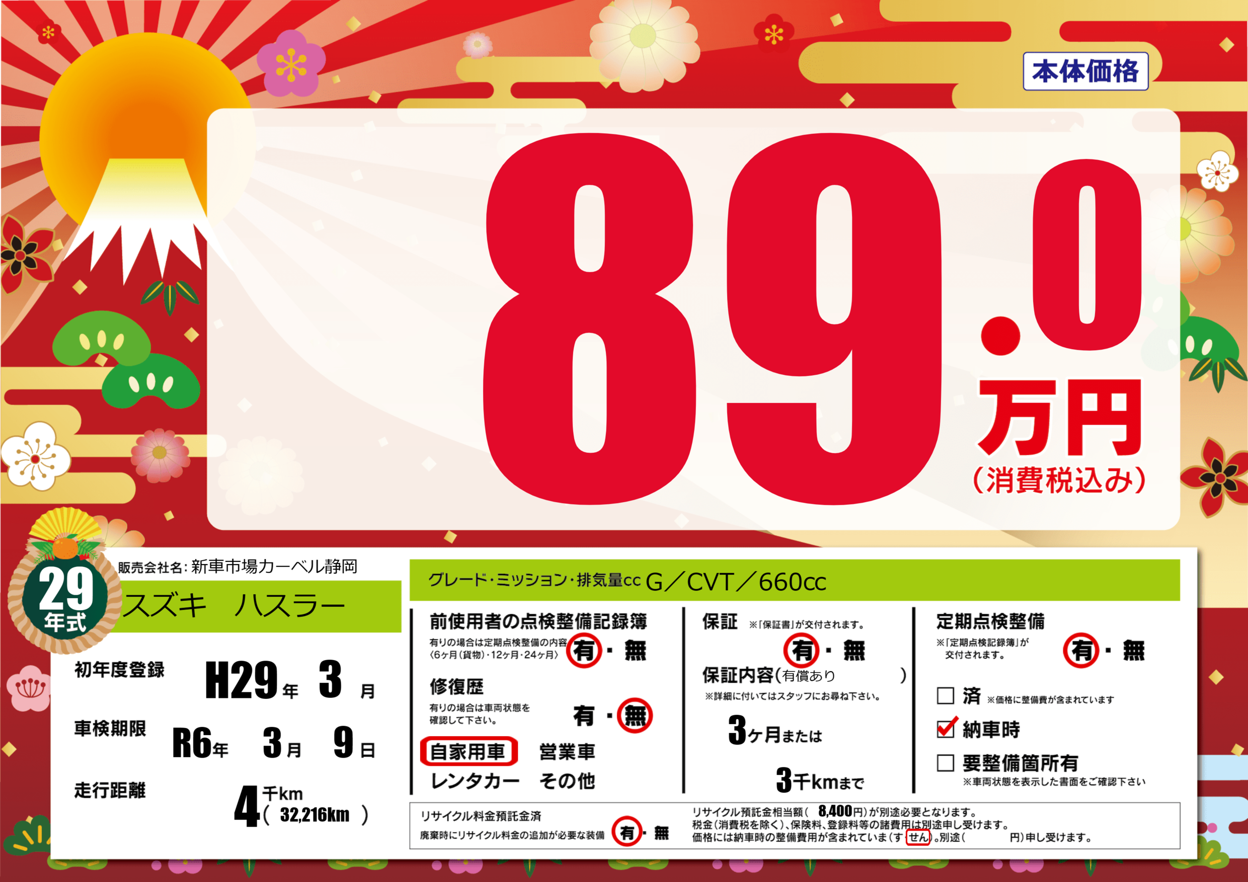 | 車名 | スズキ ハスラー | グレード ミッション 排気量 |