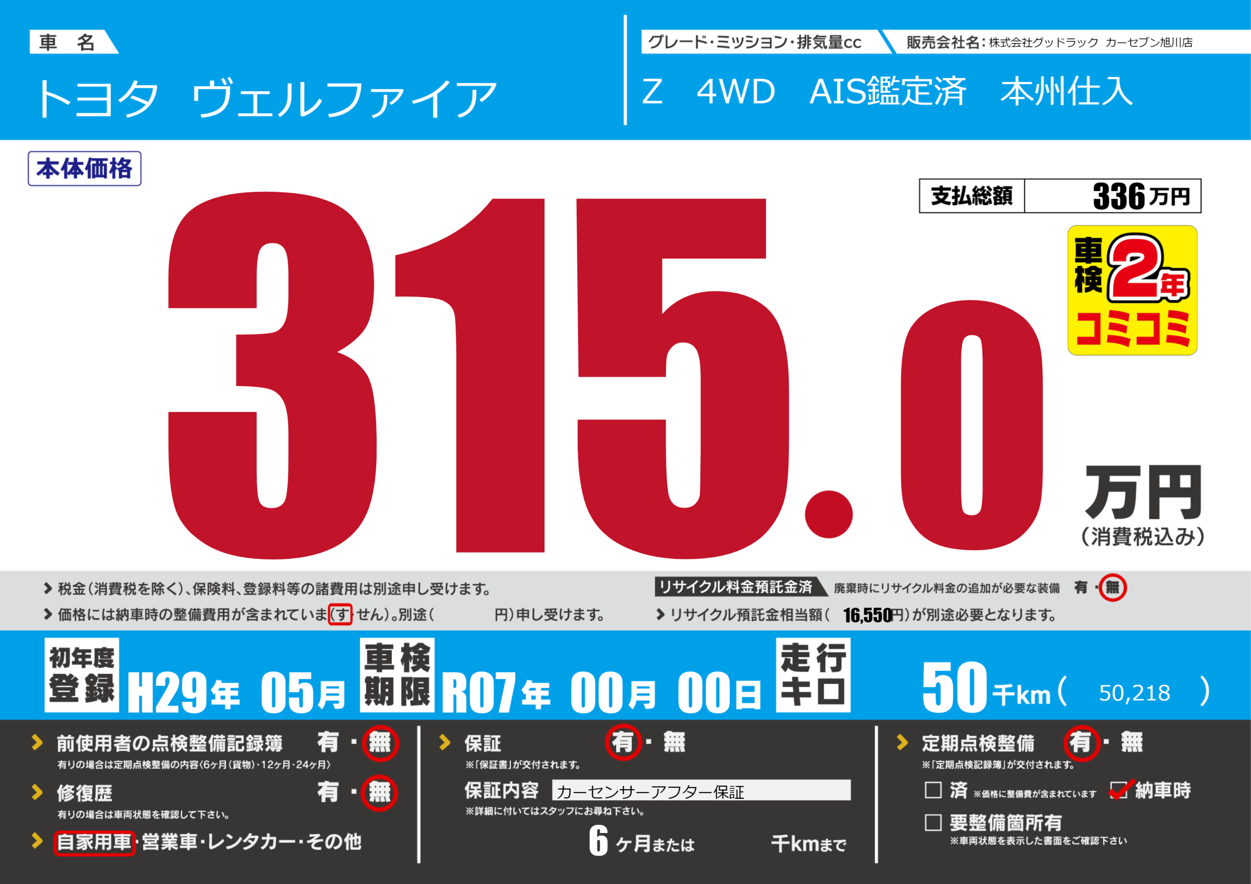 | 車名 | トヨタ ヴェルファイア | グレード ミッション 排気量 |
