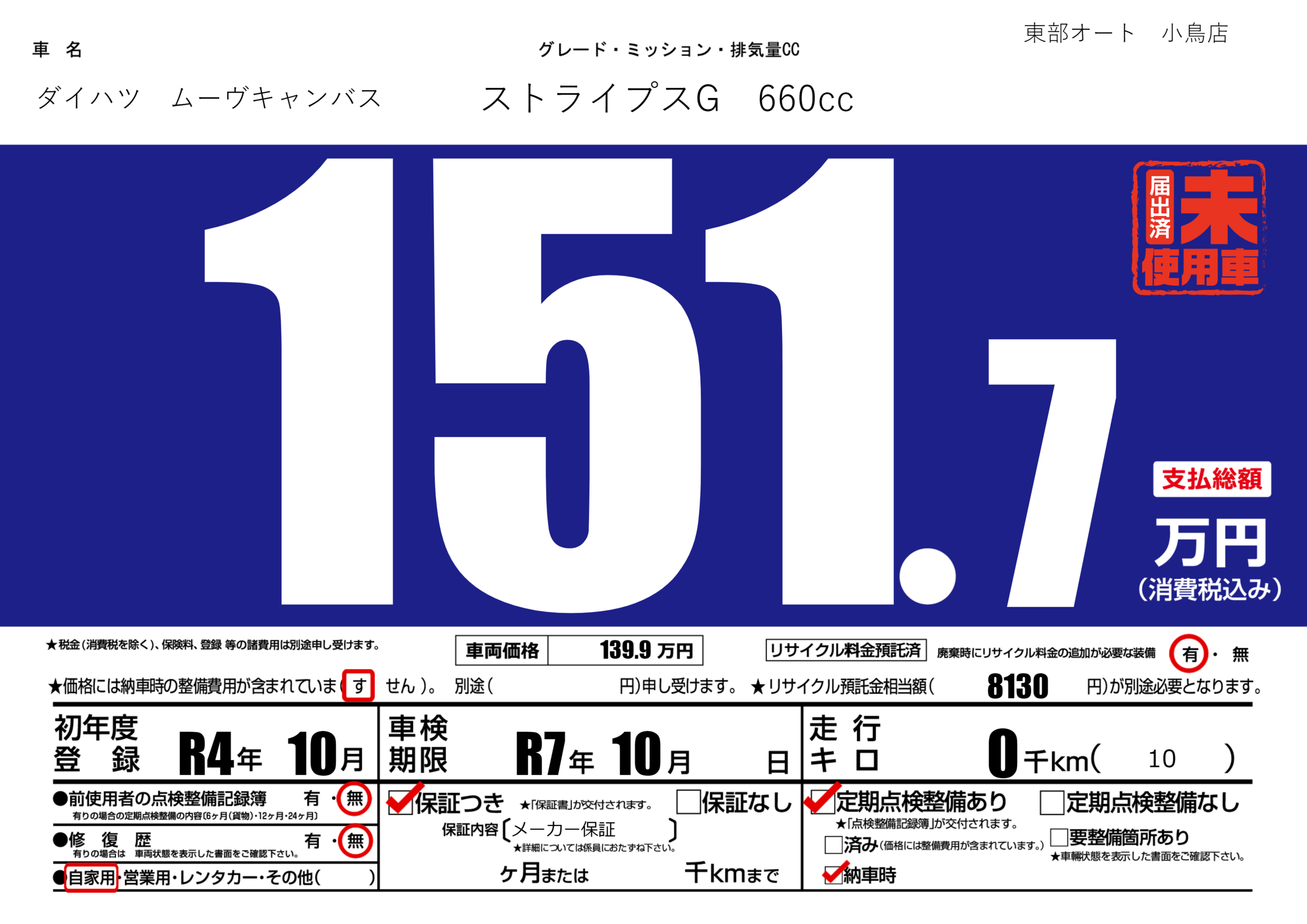 | 定期点検整備 | 定期点検整備あり 納車時あり | ||