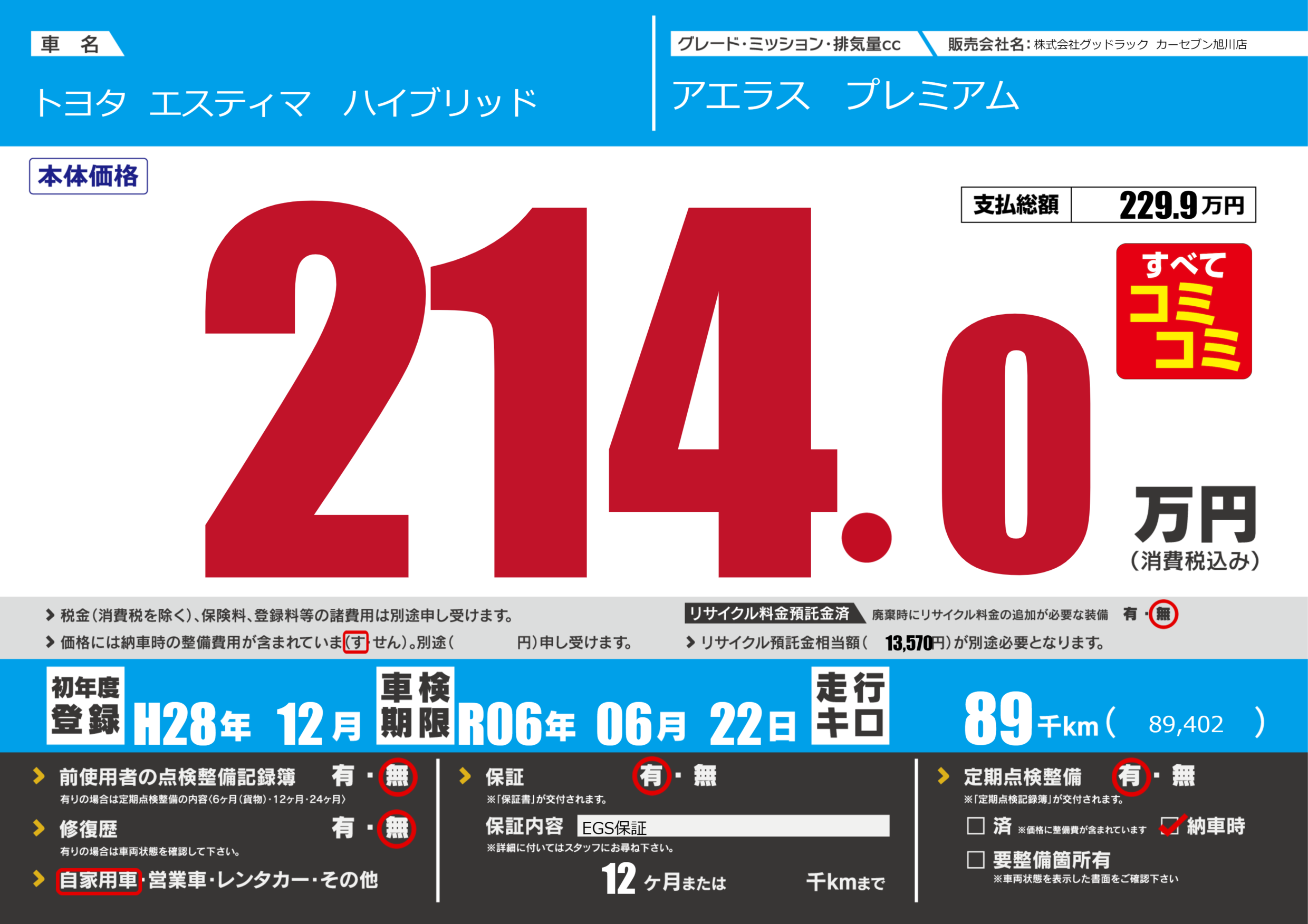 | 走行キロ | 8.9万km | 初年度登録 | H28年12月 |