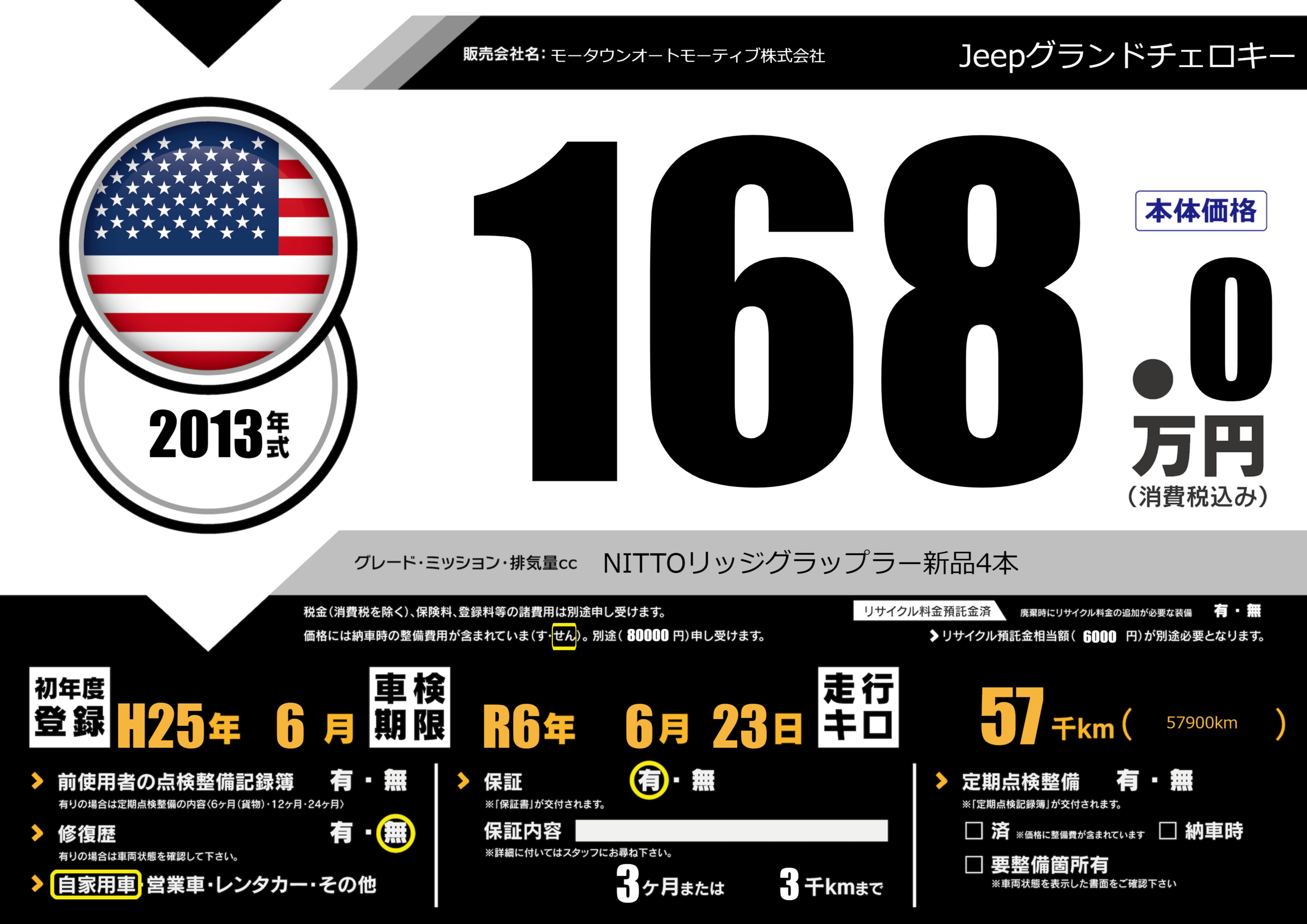 | 車名 | Jeepグランドチェロキー | グレード ミッション 排気量 |