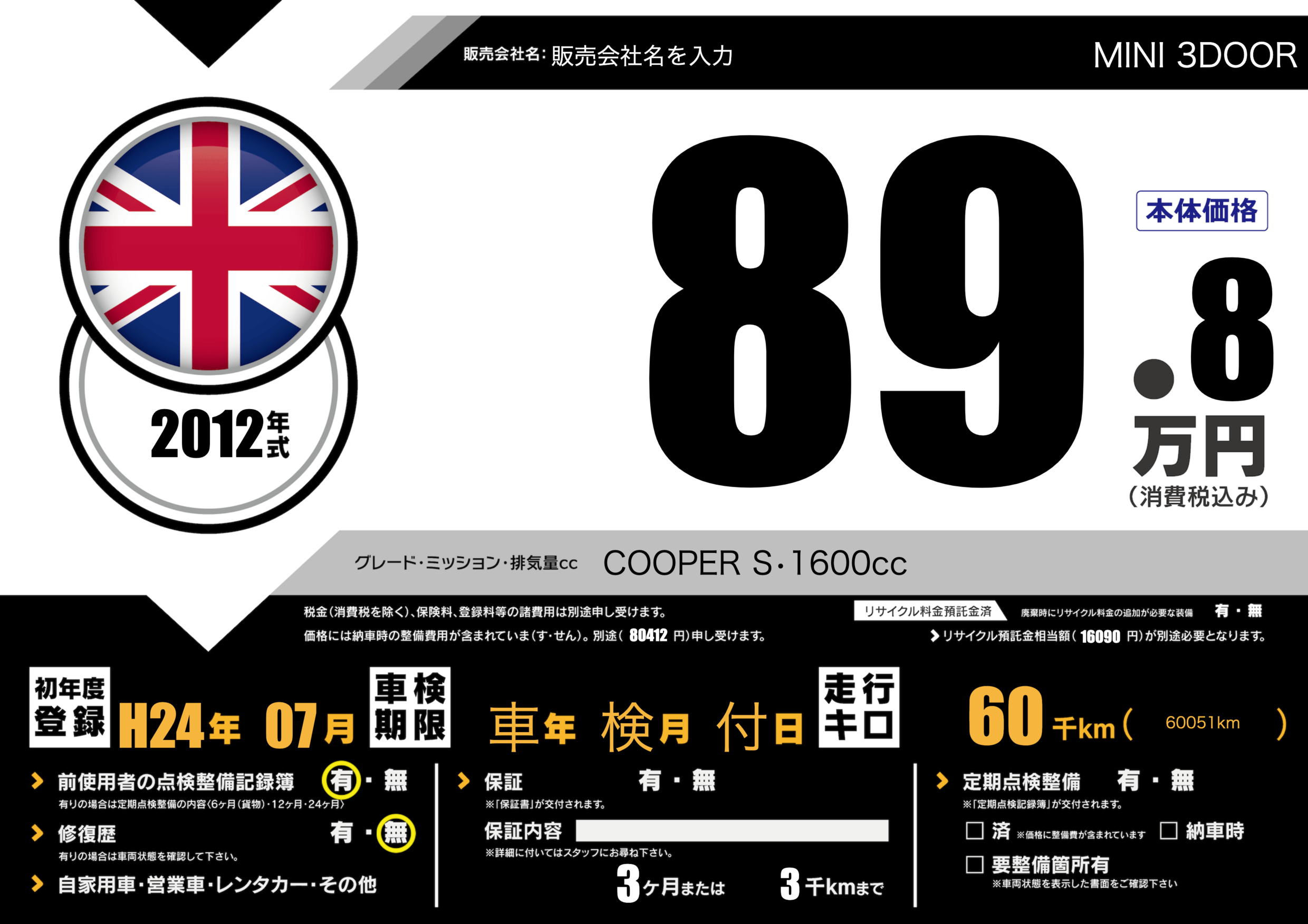 | 車名 | MINI 3DOOR | グレード ミッション 排気量 |