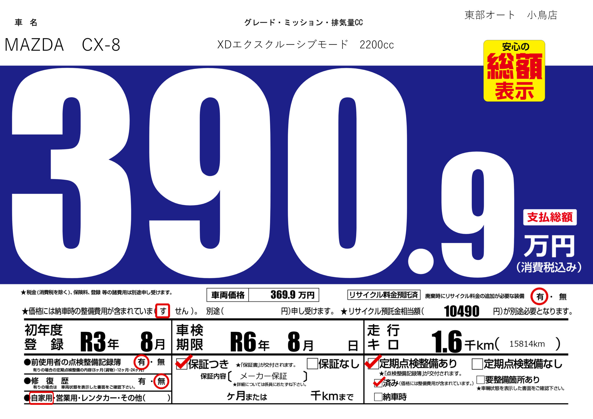 | 車名 | MAZDA CX-8 | グレード ミッション 排気量 |