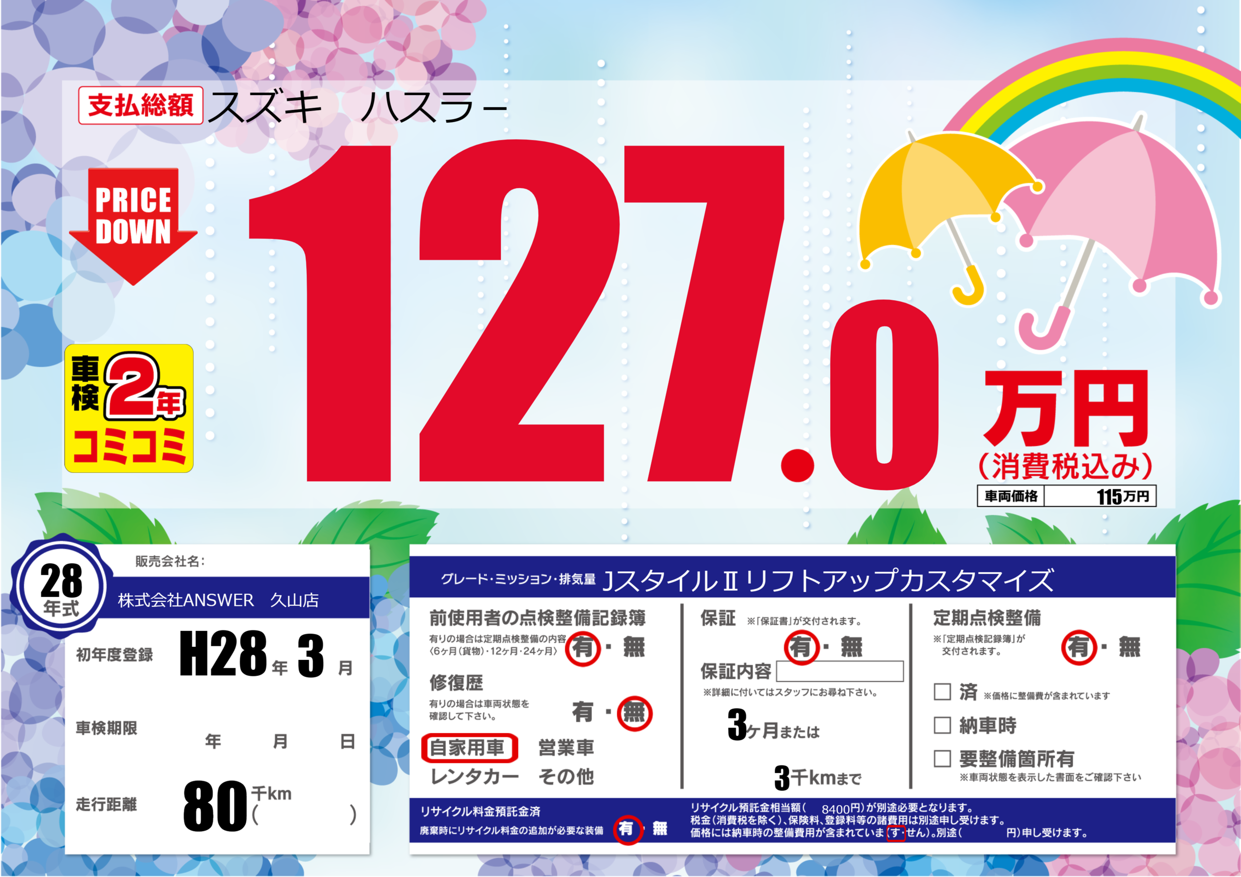 | 走行キロ | 8万km | 初年度登録 | H28年3月 |