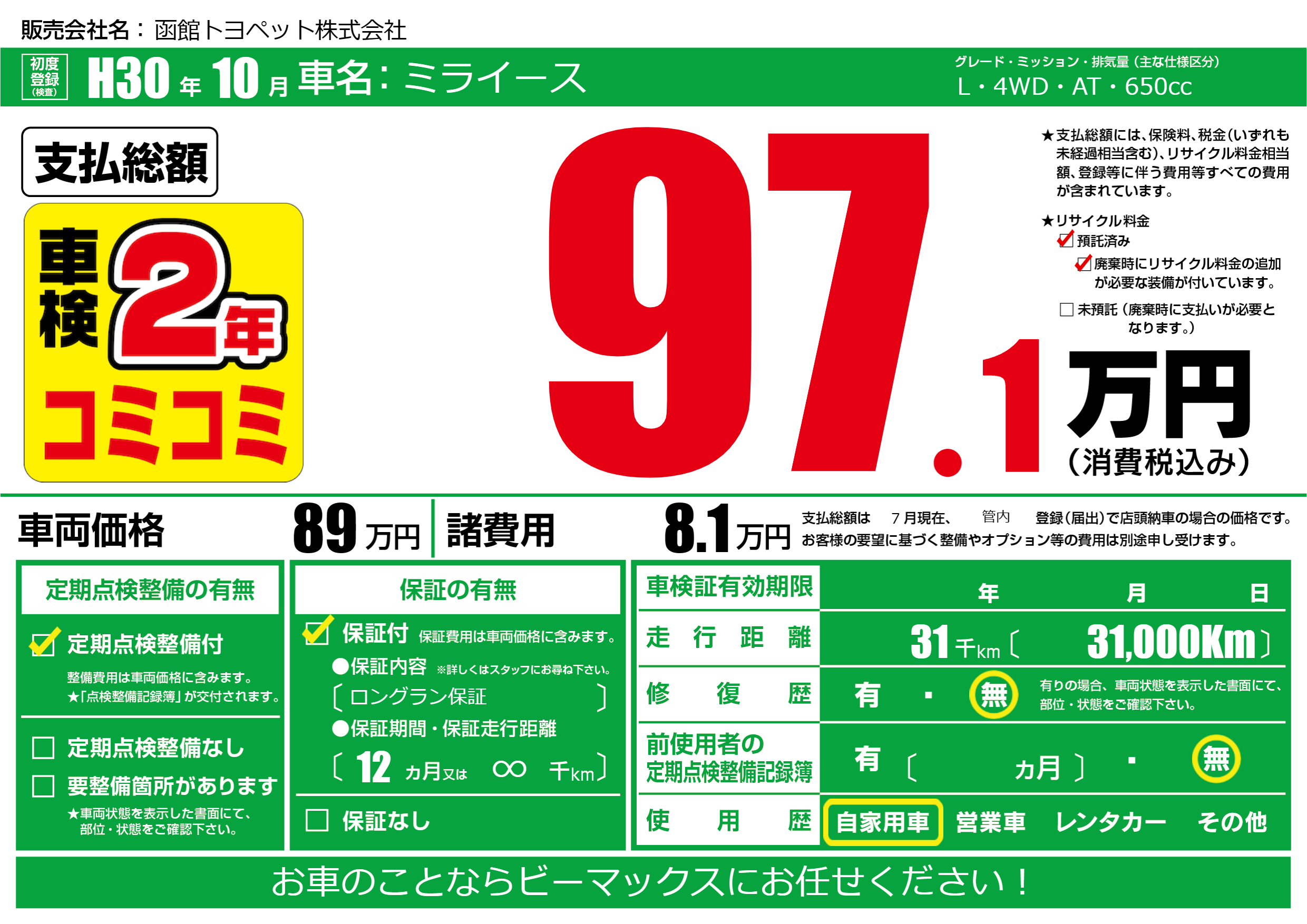| 走行キロ | 3.1万km | 初年度登録 | H30年10月 |