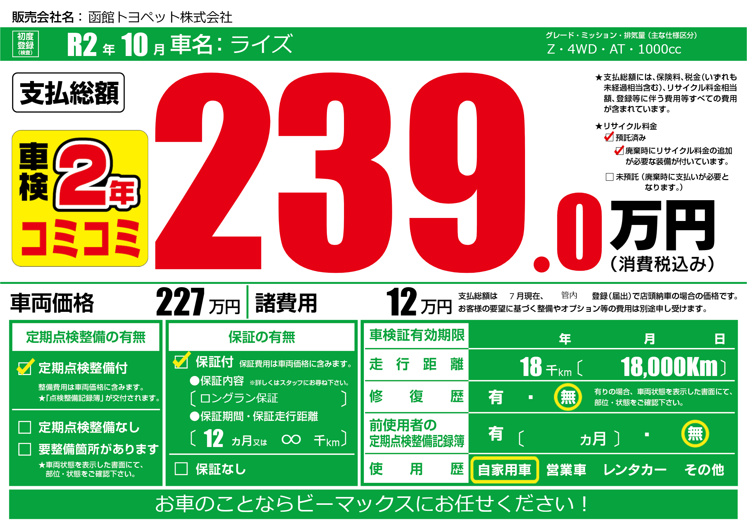 | 走行キロ | 1.8万km | 初年度登録 | R2年10月 |