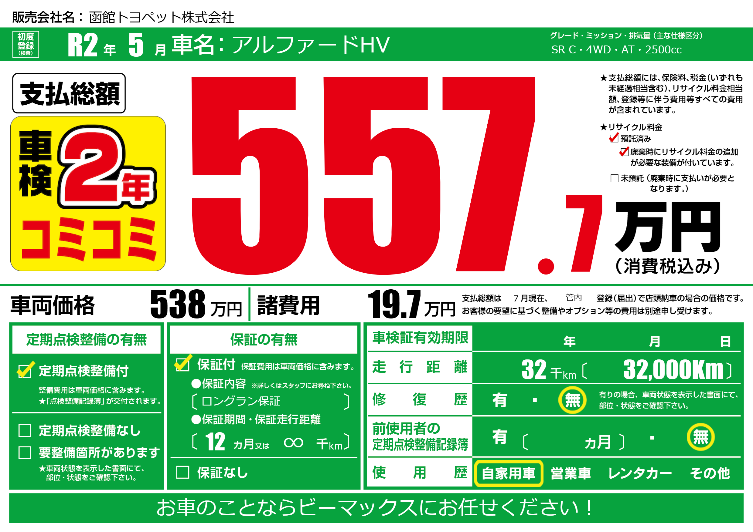 | 車名 | アルファードHV | グレード ミッション 排気量 |