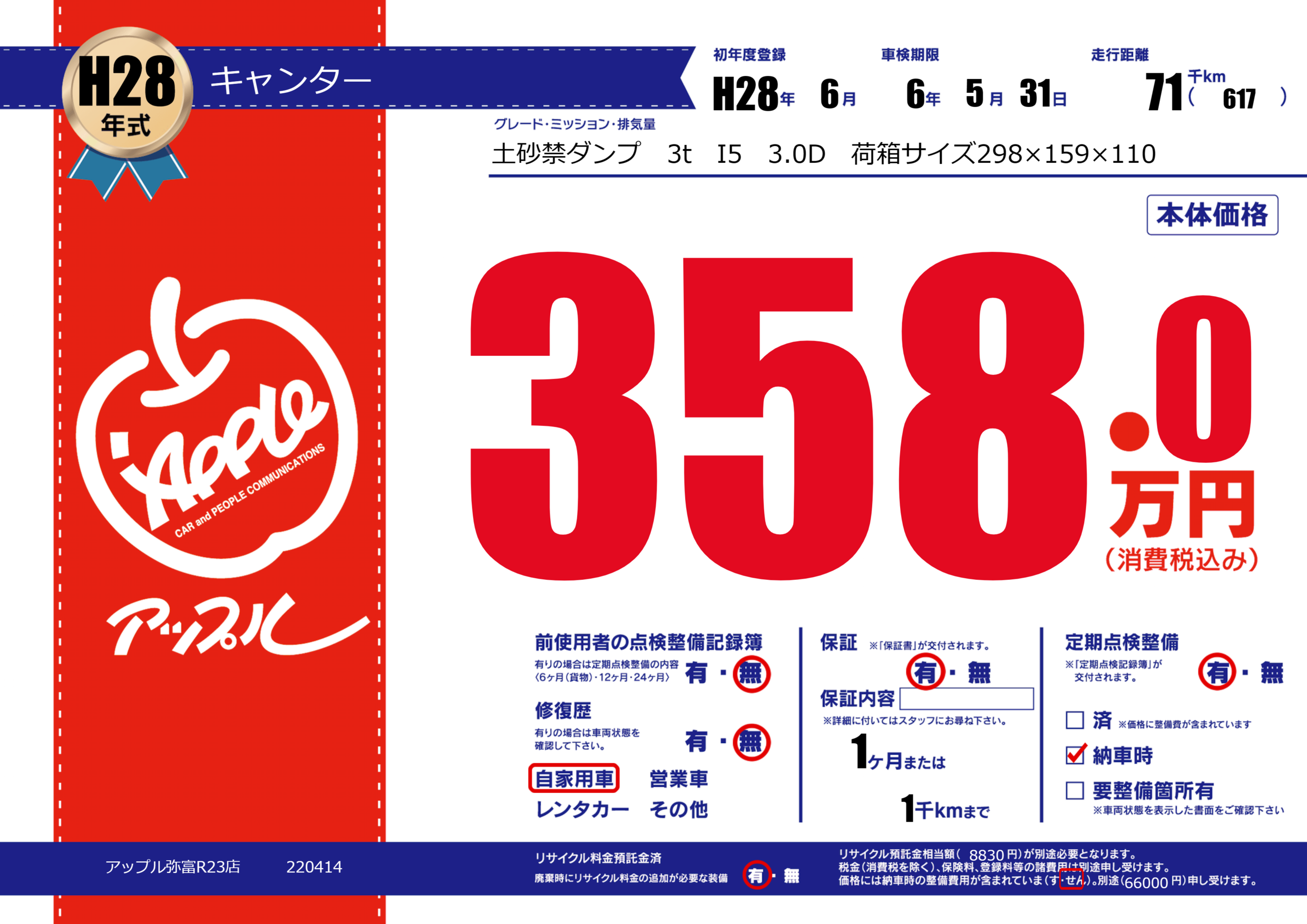 | 車名 | キャンター | グレード ミッション 排気量 |