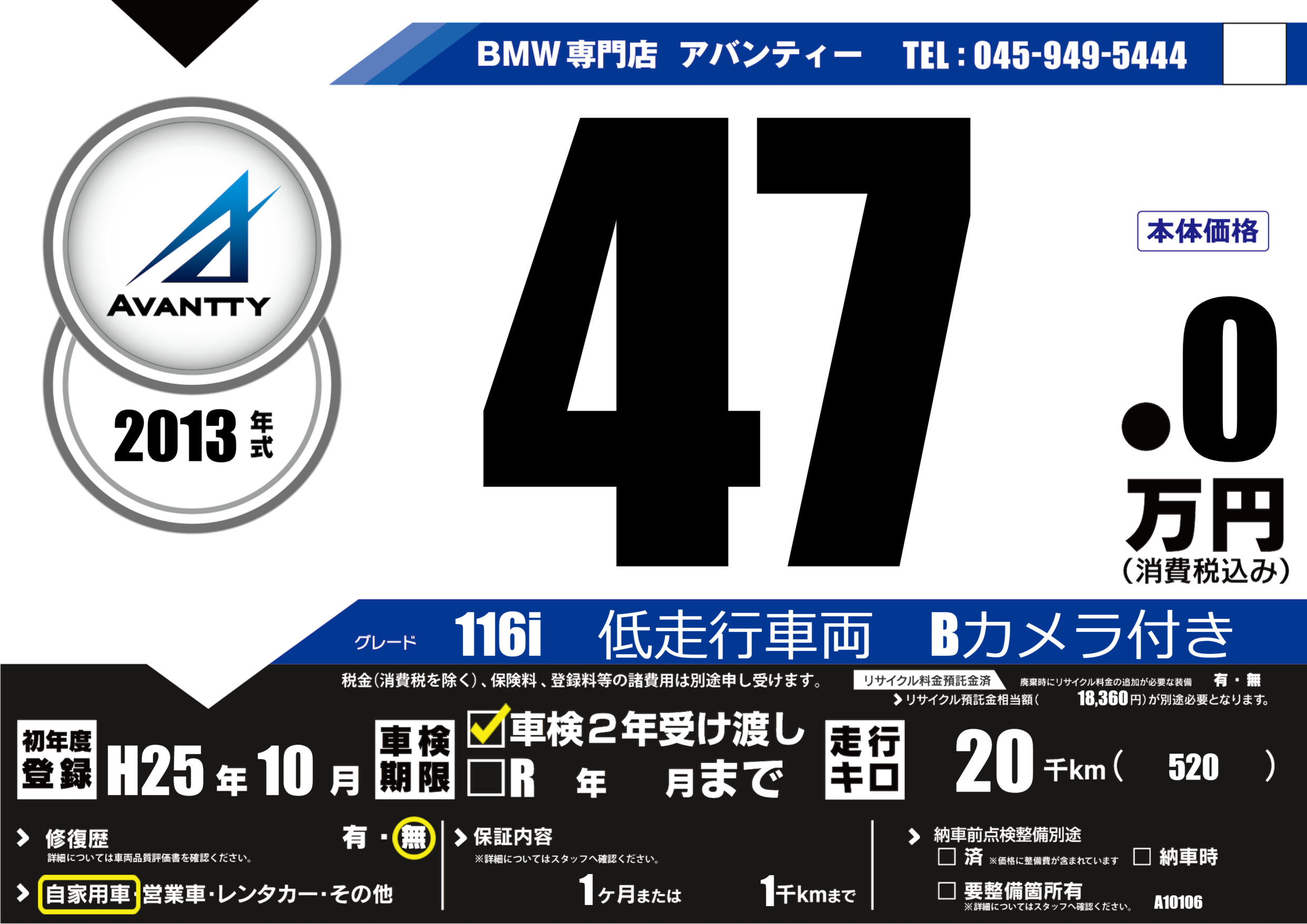 | 走行キロ | 2万km | 初年度登録 | H25年10月 |